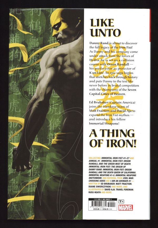 1st printing. Collects The Immortal Iron Fist (2006-2009 Marvel) #1-27, The Immortal Iron Fist (2006-2009 Marvel) Annual #1, The Immortal Iron Fist: Orson Randall and the Green Mist of Death (2008), The Immortal Iron Fist: The Origin of Danny Rand (2008 Marvel), The Immortal Iron Fist: Orson Randall Death Queen of California (2008), Immortal Weapons (2009) #1-5, IMMORTAL WEAPONS SKETCHBOOK and material from Civil War: Choosing Sides (2006) and I Am an Avenger (2010) #1.