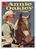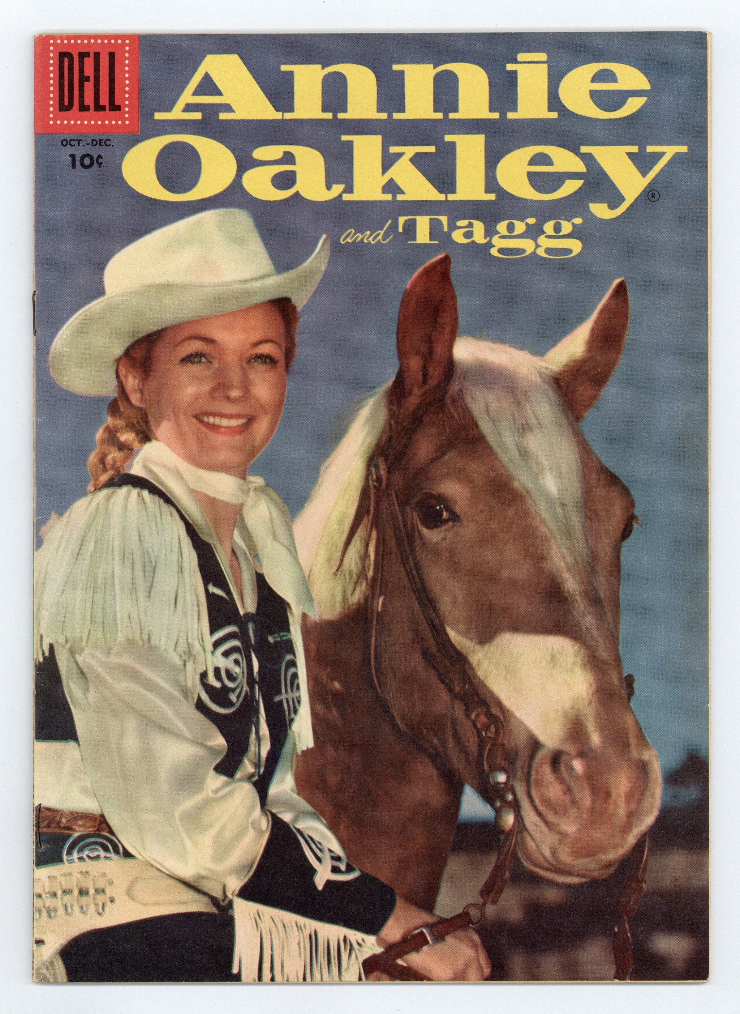Gail Davis [as Annie Oakley] photo cover. On with the Show, art by Dan Spiegle; The strongman of the Medicine Show Wagon is ill, and the professor gets help from Annie to put on his show. The Coward's Gun, art by John Ushler; To show his son the gunslinger is nothing without his gun, Gus puts blanks in Miller's gun.; Without knowing, his son changes them back. Cure for Crooks, art by Dan Spiegle; The stage is carrying the government currency shipment; When the stage is robbed, one of the mesquite-chewing hold-up men accidentally leaves a clue for Annie. Gail Davis [as Annie Oakley] pinup. 36 Pages, Full Color. Cover price $0.10.