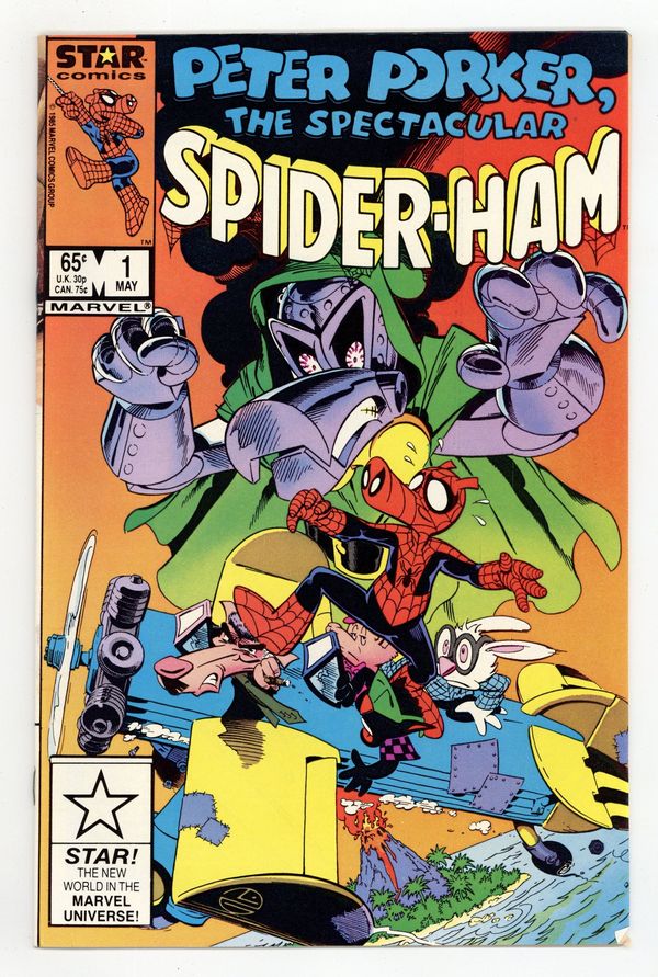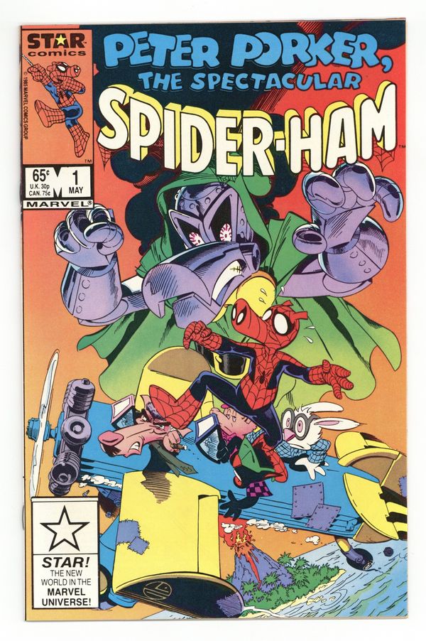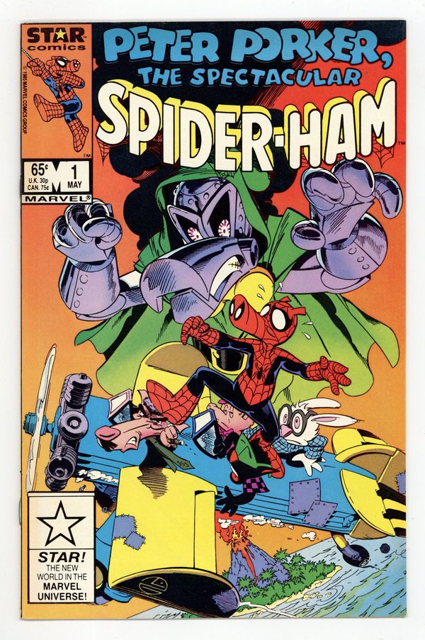Published May 1985 by Marvel/Star Comics.$24.00Direct Edition. J. Jonah Jackal, Chief editor of the Daily Beagle, Peter Porker, ace photographer, and three junior news trainees head off to investigate the St. Croix Trapezoid. However, their flight runs afoul and they crash land on the island home of the most nefarious super-villain of all...Ducktor Doom. Can the Spectacular Spider-Ham defeat the greatest enemy of the Fantastic Furs, save his friends and boss, get the front-page picture, and still keep his secret identity a secret? Brought to you in the hilarious tradition of the Looney Tunes, here comes the Spectacular Spider-Ham. Story by Steve Skeates. Art by Mark Armstrong and Joe Albelo. 32 pages. Cover price $0.65.