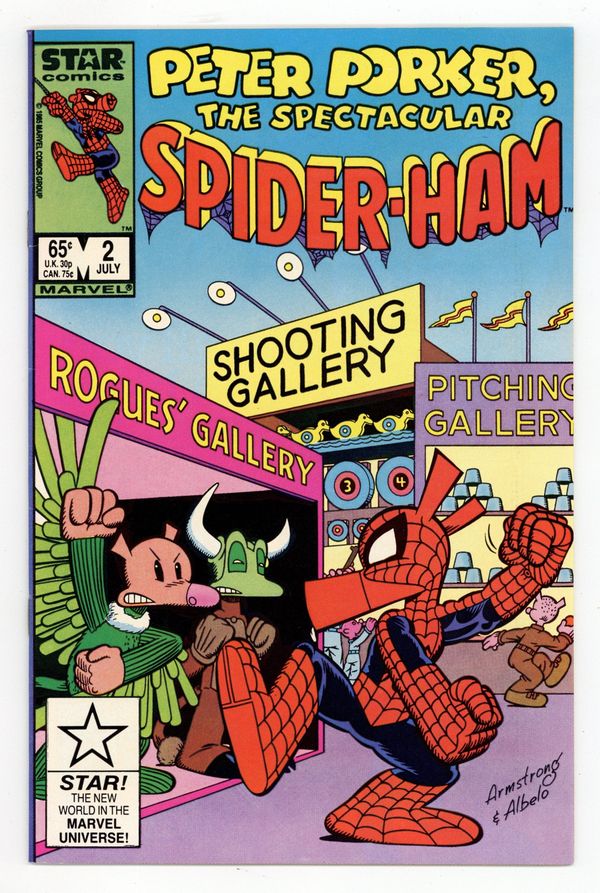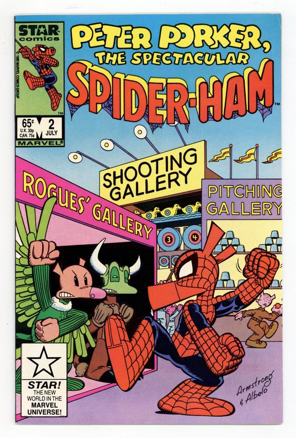 Published Jul 1985 by Marvel/Star Comics.$14.00The Spectacular Spider-Ham does battle with Buzzard and the Bullfrog, while the trashy paper Morning Scandal threatens to put J. Jonah Jackal's Daily Beagle out of business in "Of Buzzards and Bullfrogs." Script by Steve Skeates, pencils by Mark Armstrong, inks by Joe Albelo. Back-up tale: The Uncanny X-Bugs written & drawn by Steve Mellor. Cover by Armstrong & Albelo. Cover price $0.65.