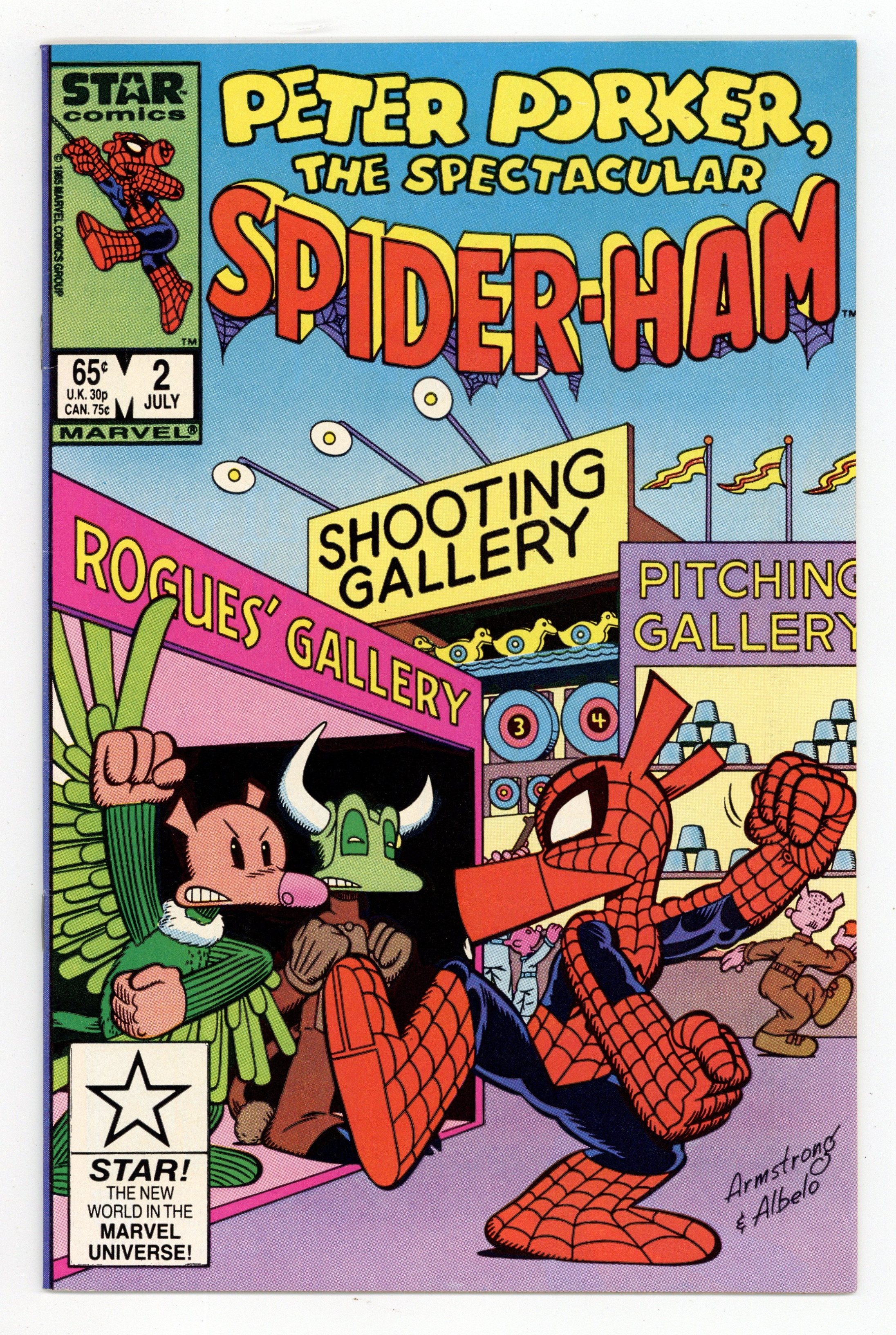 Published Jul 1985 by Marvel/Star Comics.$9.00The Spectacular Spider-Ham does battle with Buzzard and the Bullfrog, while the trashy paper Morning Scandal threatens to put J. Jonah Jackal's Daily Beagle out of business in "Of Buzzards and Bullfrogs." Script by Steve Skeates, pencils by Mark Armstrong, inks by Joe Albelo. Back-up tale: The Uncanny X-Bugs written & drawn by Steve Mellor. Cover by Armstrong & Albelo. Cover price $0.65.