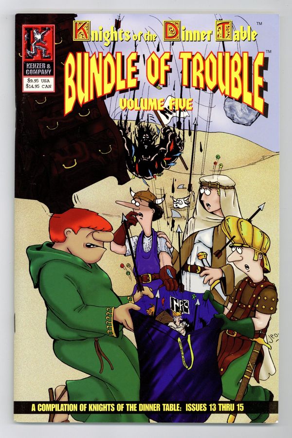 Published Feb 2000 by Kenzer Publishing.$11.00Volume 5 - 1st printing. Collects Knights of the Dinner Table (1994- ) #13-15 with extra features. Includes the original stories have been enhanced with additional footnotes and a cleaner visual presentation for your reading pleasure. Extra goodies include a special retro-KotDT section that appears nowhere else, as well as humorous KotDT trivia. Softcover, 96 pages, B&W.