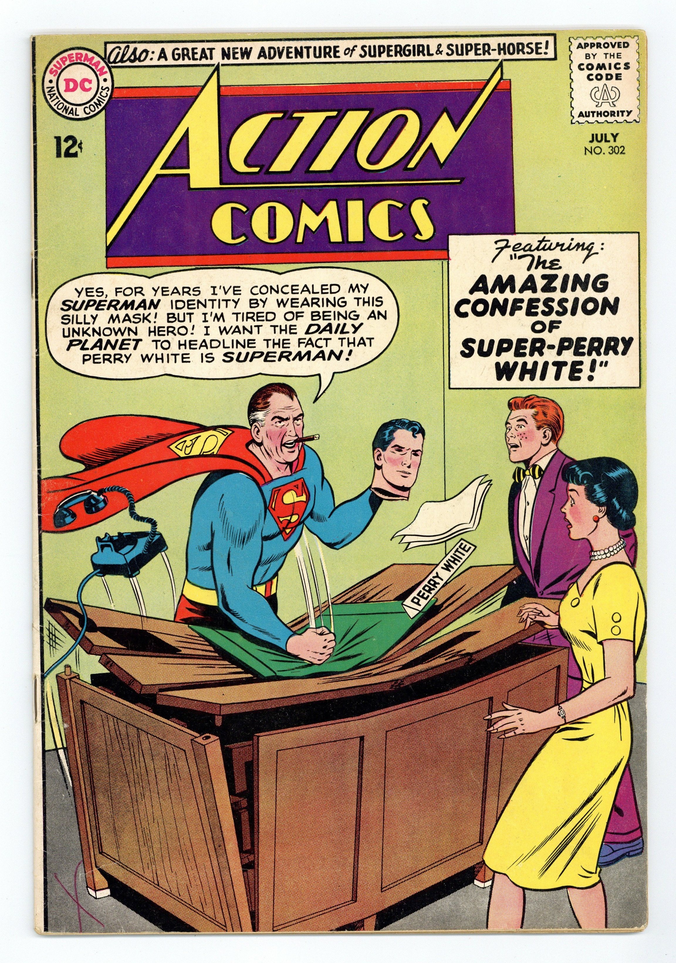 Cover pencils by Curt Swan, inks by Sheldon Moldoff. "The Amazing Confession of Perry White," art by Al Plastino; To protect Perry White from criminals who are trying to kill him, Superman pretends to be Perry, but things get complicated when Lois learns his "secret identity" and publishes the story, and when Perry gets impatient and starts to pretend that he's Superman. Celebrate the Silver Anniversary of Superman ad. "The Day Super-Horse Went Wild!", script by Leo Dorfman, art by Jim Mooney; After Supergirl and Comet save Lori Lemaris and Jerro from Vostar, an Atlantean criminal scientist, he plots revenge by telepathically commanding Comet to go on a destructive spree through time and space. 36 Pages, Full Color. $0.12 "This is Part 4 of 4 of a running gag of covers that homage each other by legendary Superman artist Curt Swan that ran from 1958 to 1963. It is a series of covers I'm calling "The Desk Smash," and they appeared on the covers for Action Comics #237, 264, 284, and 302." – Odinson, mycomicshop.com Archivist. Cover price $0.12.