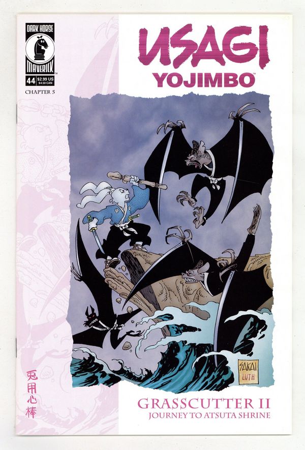 Published Dec 2000 by Dark Horse.$13.50Grasscutter II: Journey to Atsuta Shrine Part 6 of 7 - Story and art by Stan Sakai. Chizu, the head of the Neko Ninja clan, has betrayed Usagi and stolen the sword Grasscutter. Now, Usagi, Sanshobo, and Gen must desperately track her down before she throws the Blade of the Gods into the sea where it will be lost forever, however the Komori bat ninja clan are also on Chizu's trail, with their own plans for the fabled sword! Written and drawn by Stan Sakai, this issue marks the penultimate chapter in the Grasscutter II story arc, the follow-up to last year's award-winning Grasscutter saga! 32 pages, B&W. Cover price $2.99.