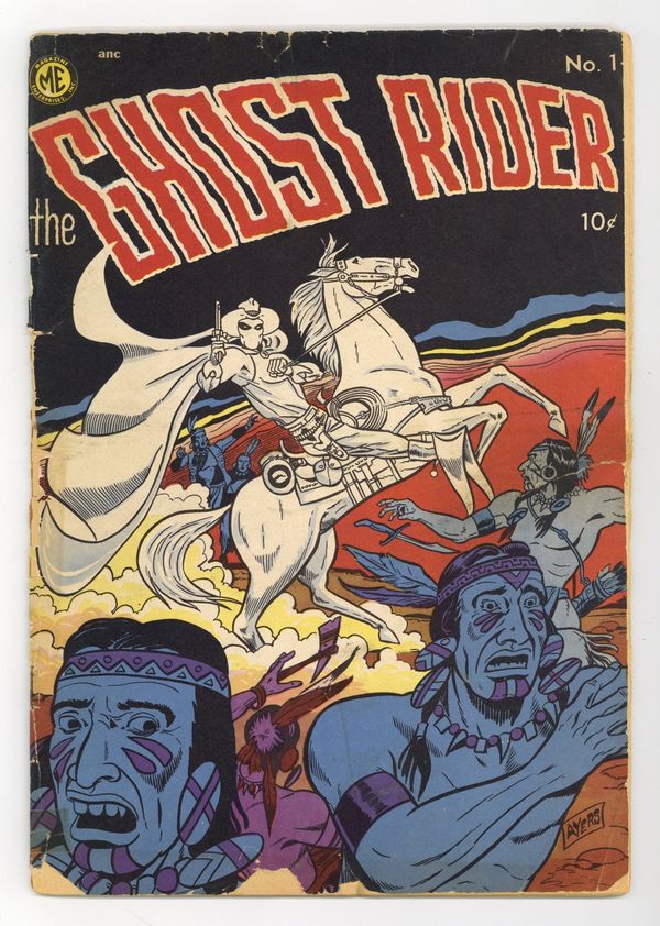 (A-1 Comics #27) Cover by Dick Ayers. Edited by Raymond C. Krank. Stories and art by Gardner Fox, C. W. Winter, Howard Larsen and Dick Ayers. Sometimes listed as A1 Comics (1944 Life's Romances) #27. Part of A1 Comics, an anthology from Magazine Enterprises with content that varied from month to month. The masked gunslinger formerly known as The Calico Kid (actually Marshal Rex Fury) takes on a new identity, using special effects to fool evildoers into thinking he is a vengeful spirit; Outlaws face the various tricks Ghost Rider uses to appear as if he is an actual ghost. This was the first character to use the name and the very cool Western-themed Ghost Rider design, both of which have remained in use to the present day, but for different characters. The Ghost Rider; The Fire Ghost!; The Saga o' Sagebrush Sam; Spook Justice; Western 36 pages, Full Color. Cover price $0.10.