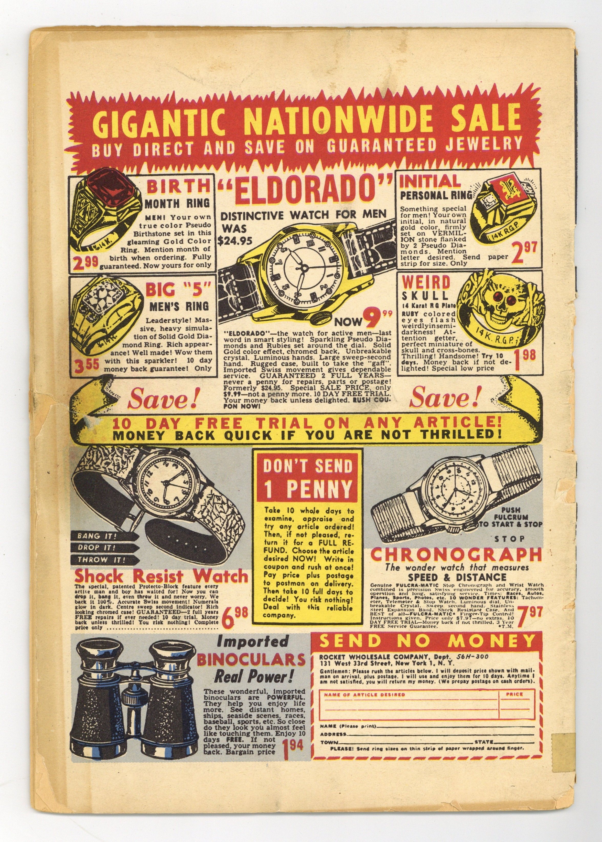 Published 1950 by Magazine Enterprises.$425.00- 3" cumulative spine split. Centerfold detached. Interior tearing. Cover-to-cover edge tears. Cover and interior oxidation.