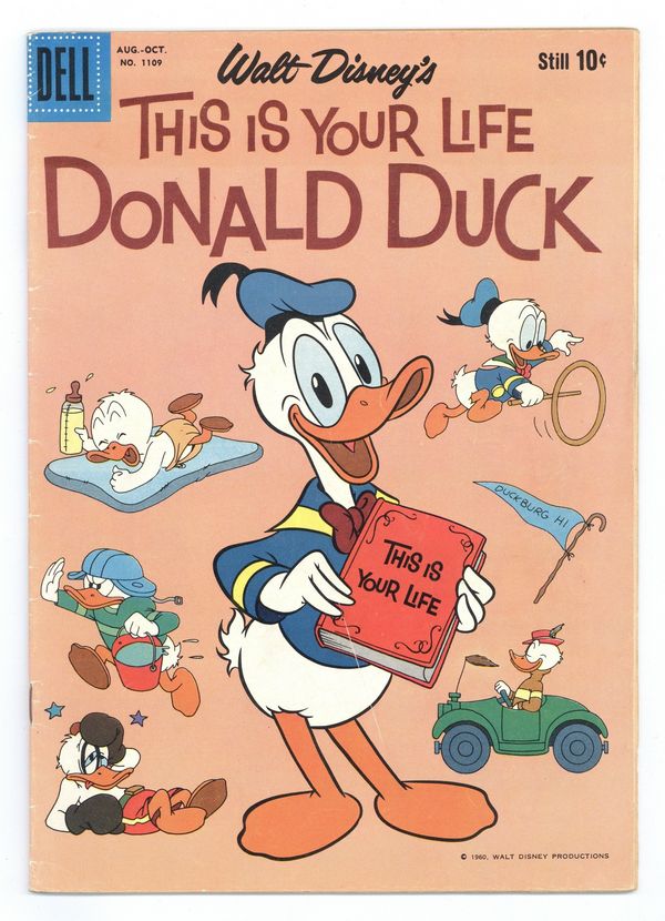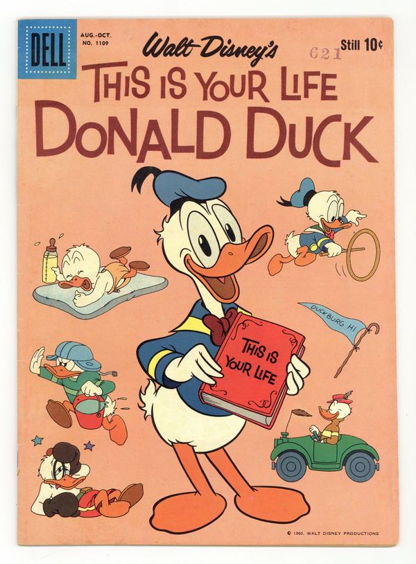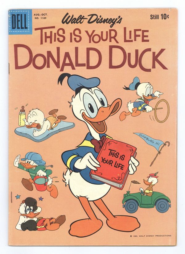 Ad back cover. "This Is Your Life, Donald Duck" - Written by unknown (adaptation). Art by Tony Strobl and Steve Steere. Cover pencils by Tony Strobl. Adapted from the Disney cartoon of the same title. Starring Donald Duck, Jiminy Cricket, Huey, Dewey and Louie, Grandma Duck, Mickey Mouse, Goofy, Pluto, Daisy Duck, Gladstone Gander, Gyro Gearloose, Bongo, Dumbo, Three Little Pigs, Uncle Scrooge, Gus Goose, Big Bad Wolf, Clarabelle Cow and Beagle Boys! 36 pages, full color. Cover price $0.10.