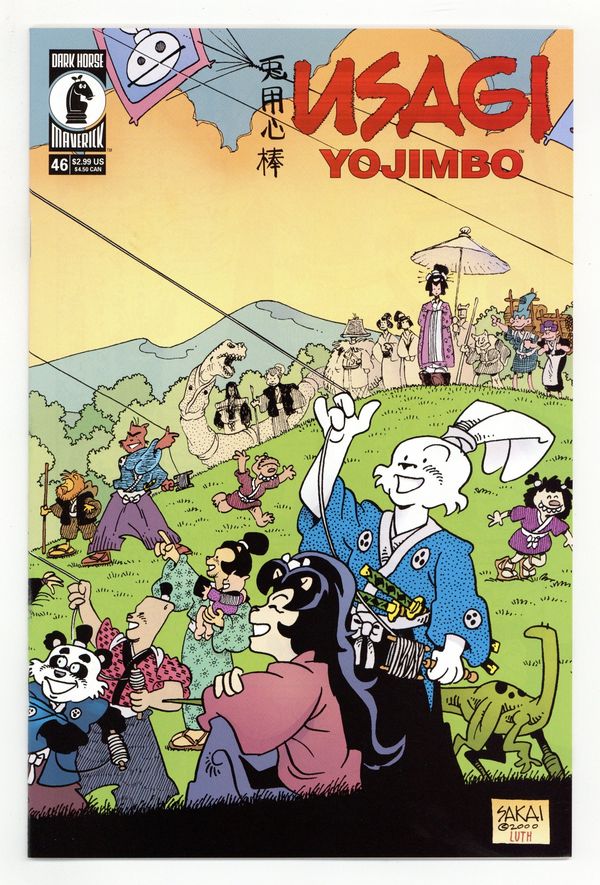 Published Mar 2001 by Dark Horse.$13.50Story and art by Stan Sakai. It takes more than a pair of swords to be a samurai, and this is something Usagi knows well. Our furry friend and his comrade, Gen, have wandered into a town dominated by two rival gangs, and in a scheme to break the gangs' power, they each join a rival faction. When up against a formidable enemy, it can sometimes be wise to infiltrate your foe and learn of his intentions, but Usagi's plans go astray, and it's trouble for our fuzzy samurai friends. Usagi Yojimbo #46 is the first of a two-part story featuring connecting, wraparound covers that combine to form one large poster-size image! 32 pages, B&W. Cover price $2.99.