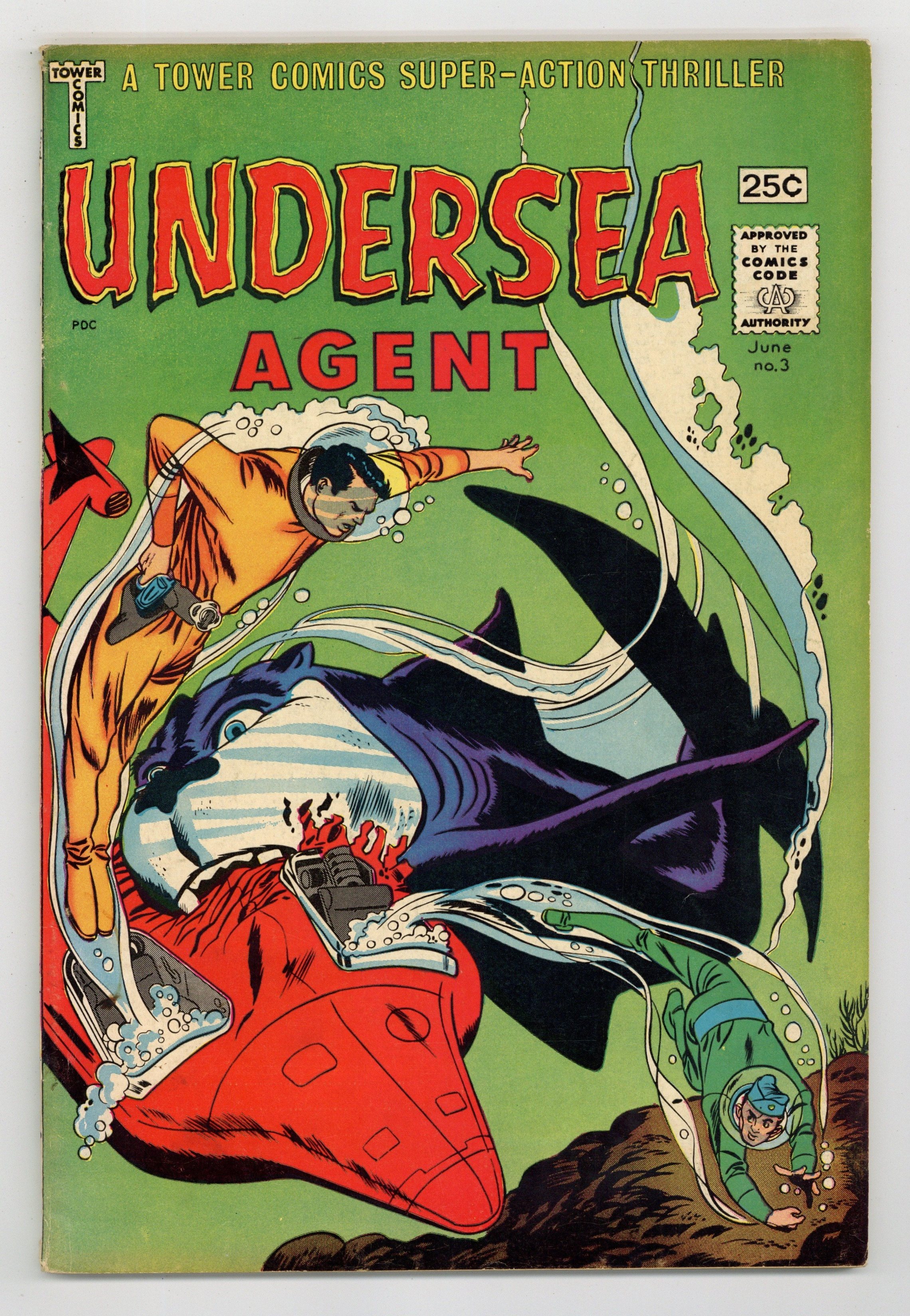 Cover by Mike Sekowsky and Frank Giacoia. Stories and art by Gil Kane, Steve Skeates, Ray Bailey, John Giunta, Mike Sekowsky and Frank Giacoia. A spinoff of Tower's THUNDER Agents books, as Lt. Davey Jones and hero-team UNDERSEA defend the Earth's oceans from super-villainy. Davey's date is interrupted by agents of Dr. Mayhem, so he trails them back to the mad scientist's island hideout. Electric-powered Davey gains the power of super-magnetism, in a story featuring early art by future Marvel legend Gil Kane. An enemy sends an android duplicate of Lt. Jones to Atlantis - but which enemy? To Save a King; At the Mercy of Dr Mayhem; The Panther Whales; The Will Warp; True or False. 64 pages, Full Color. Cover price $0.25.