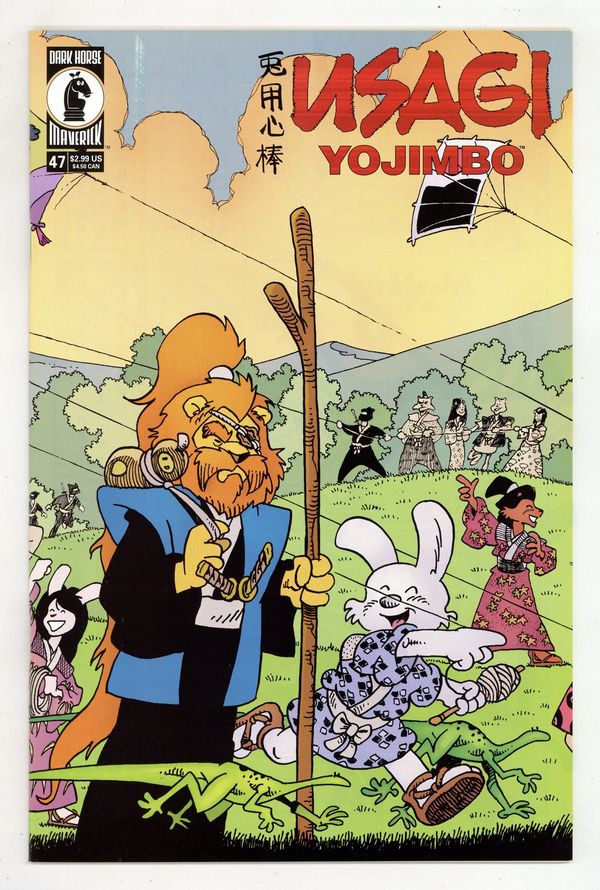 Published Apr 2001 by Dark Horse.$11.25Story and art by Stan Sakai. Trouble is brewing for Usagi and Gen. In an attempt to rescue a small town from the grip of rival gangs, our animal samurai duo joined separate gangs to work from the inside, but someone has found out about their plan, and when the bosses find out...! To add fuel to the fire, there's another sword-for-hire on his way to town. He could arrive at any time, but whose side will he be on? Don't miss this second issue of a two-part story line, featuring a wraparound cover that connects with the cover of issue #46 to form one giant poster-style image. 32 pages, B&W. Cover price $2.99.
