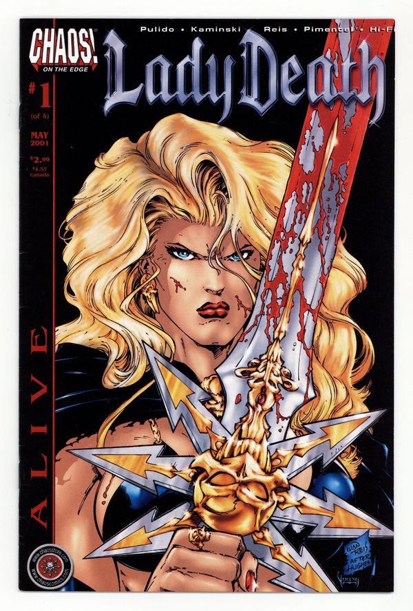 by Brian Pulido, Len Kaminski, & Various. Chaos! launches into the 21st century with a new take on Lady Death that's perfect for a new generation of readers! Gone is the pale skin, pupiless eyes, steely remote exterior, and white hair. Now she's real flesh and blood ?? mortal! At the crossroads of her destiny, Lady Death finds herself seemingly abandoned by her mentor, the Grim Reaper. Without her immense power can she survive the apocalyptic badlands and reclaim her power? Or, will her newfound humanity take her in another direction all together?! Each issue of Lady Death: Alive is now completely self-contained. FC, 32pg (1 of 4 Cover price $2.99.