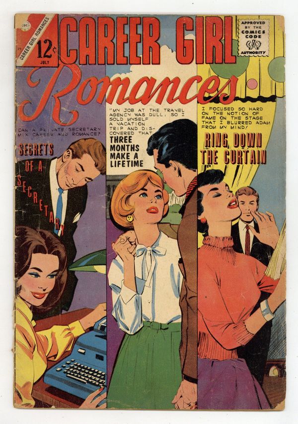 Cover inks by Dick Giordano. Stories by unknown. Art by Vince Colletta studio and unknown. Nurse Betsy Crane stars in "The Dedicated Man"! Can a private secretary mix career and romance? Read..."Secrets Of A Secretary"! Her job at the travel agency was dull, so she sold herself a vacation trip and discovered that..."Three Months Make A Lifetime"! And Diana focused so hard on the notion of fame on the stage that she blurred Adam from her mind in..."Ring Down The Curtain"! Plus: 1-page text story "Woman To Woman"! 32 pages, full color. Cover price $0.12.