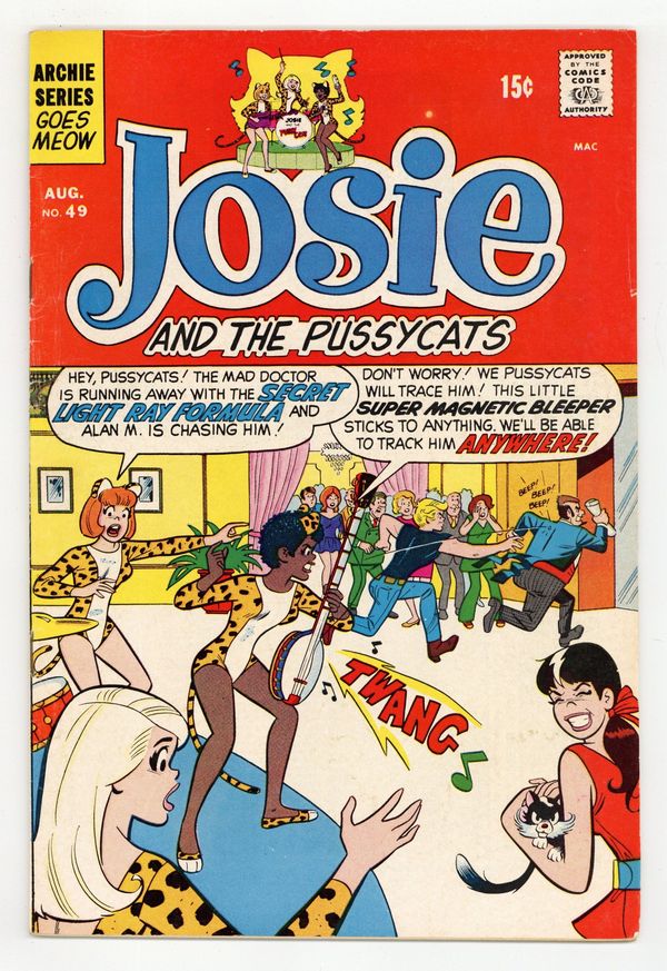 Tags: ArchiePublished Aug 1970 by Archie Publications.$25.00Cover pencils by Dan DeCarlo, inks by Rudy Lapick. Pussyfooting With the Pussycats, script by Frank Doyle, pencils by Dan DeCarlo, inks by Rudy Lapick; The Pussycats have a gig at the Milton Hotel to play at a private party for Professor Lamebrane, inventor of a secret formula for slow light; With Alex as their manager and Alan M. as their roadie, the girls set off in their van for the hotel; Wanting to get in on the action, Alexandra and Sebastian teleport to the hotel, where Alexandra uses her magic powers to switch the secret formula with one of the Pussycats' songs. A Dirty Play! one-page strip with Li'l Jinx by Joe Edwards. 36 pgs. $0.15. Cover price $0.15.