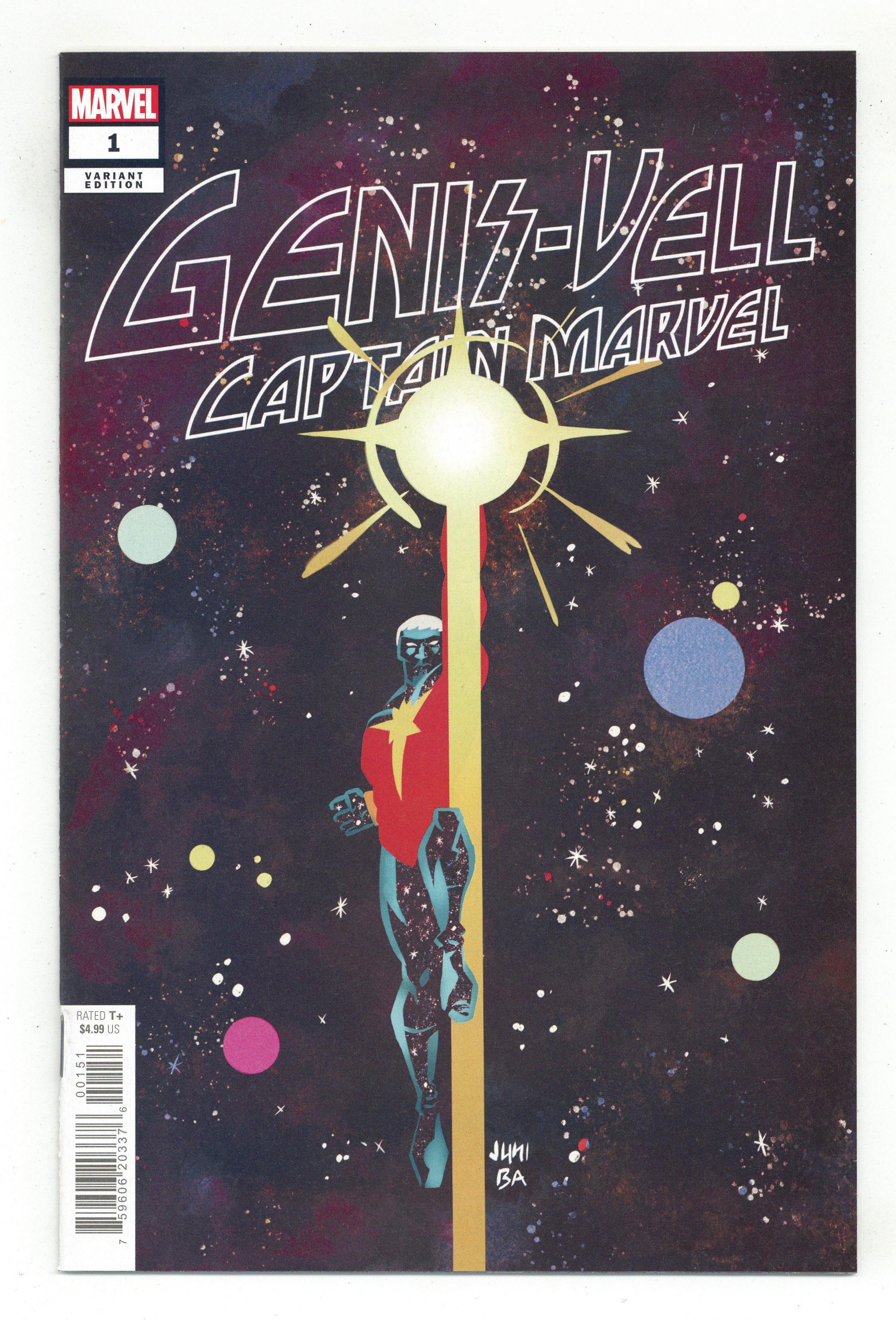 $2.50Limited 1 for 25 Retailer Incentive Variant Cover. Written by Peter David. Art by Juanan Ramirez. Cover by Juni Ba. PETER DAVID RETURNS TO GENIS-VELL, SON OF THE ORIGINAL CAPTAIN MARVEL! Both now back in the land of the living, Genis-Vell and Rick Jones are about to come crashing back into each other! Witness Genis-Vell, Captain Marvel return to the pages of his very own series written by legendary scribe Peter David, drawn by artist Juanan RamÃrez! Can Rick Jones save Genis - and himself - before they both fade out of existence? Is Rick's ex-wife, Marlo, the key? Find out when Peter David returns to take Genis-Vell to all-new heights! 36 pages, full color. Rated T+ Cover price $4.99.