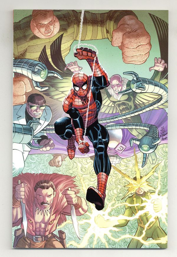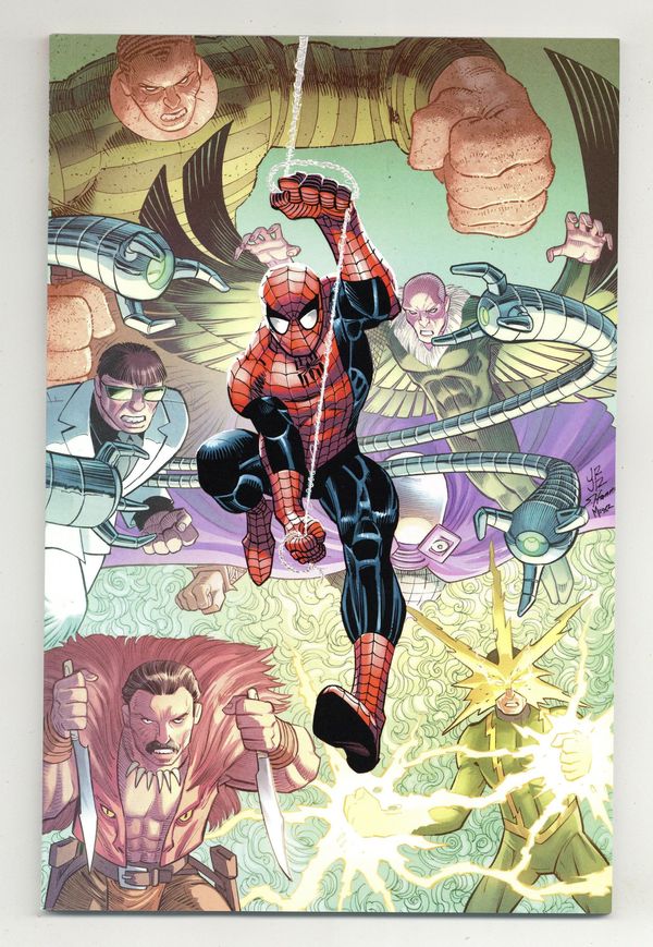 Tags: Spider-Man$12.00Limited 1 for 100 Retailer Incentive Variant Cover. Written by Zeb Wells. Art by Ed McGuinness. Cover by John Romita Jr. LANDMARK ISSUE #900! The nine-hundredth issue of AMAZING SPIDER-MAN comes out the month of Spider-Man's 60th Anniversary, and we are pulling out ALL THE STOPS! Someone from Spider-Man's past has captured the Sinister Six and used them to create the truly terrifying SINISTER ADAPTOID! This is one of the biggest adventures in Spider-History and you will not believe the ending! Cover price $9.99.