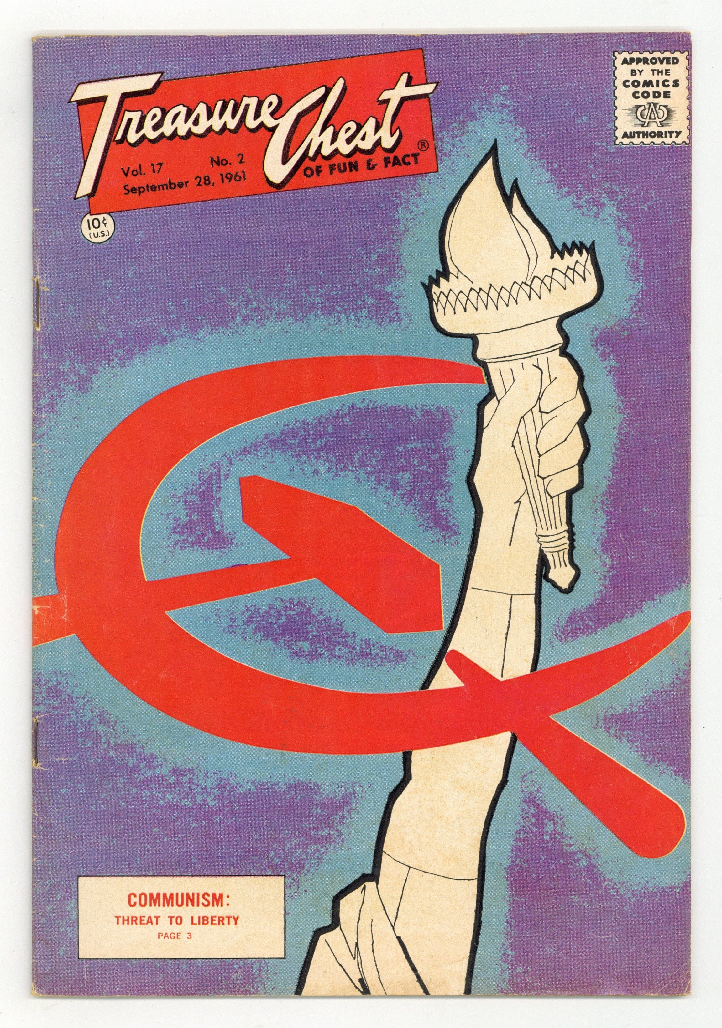 Published Sep 1961 by George A. Pflaum.$80.00Sept. 28, 1961 issue. Anti-Communist cover. Excellent Reed Crandall art (6 pages) for "This is Communism," Chapter 1 in a series on the communist threat to our liberty. We thought the commies were a real concern back then, but fortunately, communism is dead (Thank you, Ronald Reagan) pretty much everywhere except in a few backward countries and in the minds of goofy college professors. Cover price $0.10.