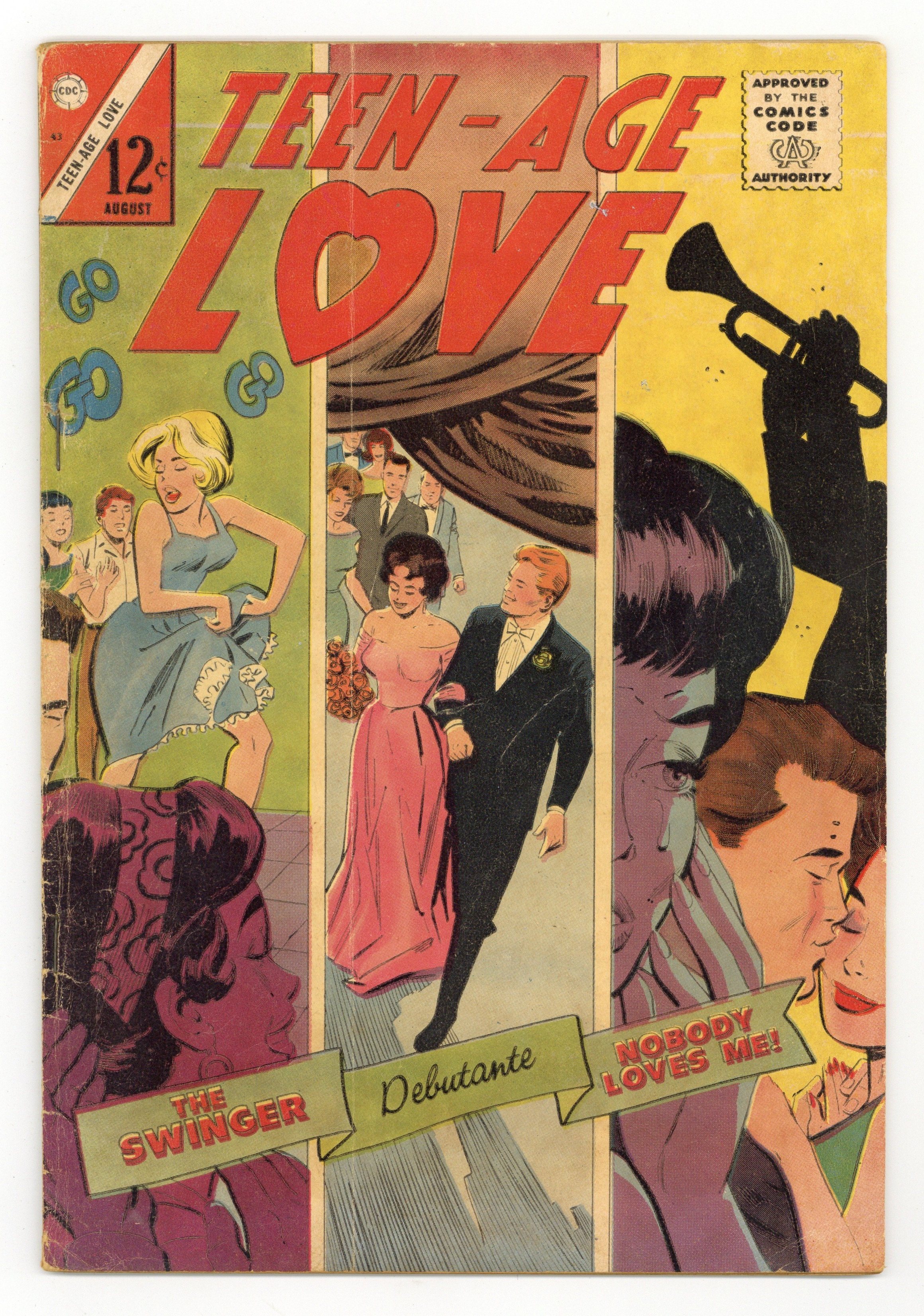 Cover by Dick Giordano. Stories and art by Sal Gentile, Dick Giordano and Vince Colletta. Charlton's long-running romance comic coincides with the blossoming of America's teen culture from the 1950s to the 1970s. Strait-laced Dory is bored with her life, so she goes out for a night of dancing with Joy and her "wild" friends. Debutante Gale marries Chad, her date for the coming-out party, but married life gives them both a reality check. Resort director Mary doesn't have time for the kinds of romances she sees all around her, until she meets new swimming instructor Dick. Swinger; The Non-Genius Genius; Debutante; Nobody Loves Me. 32 pages, Full Color. Cover price $0.12.