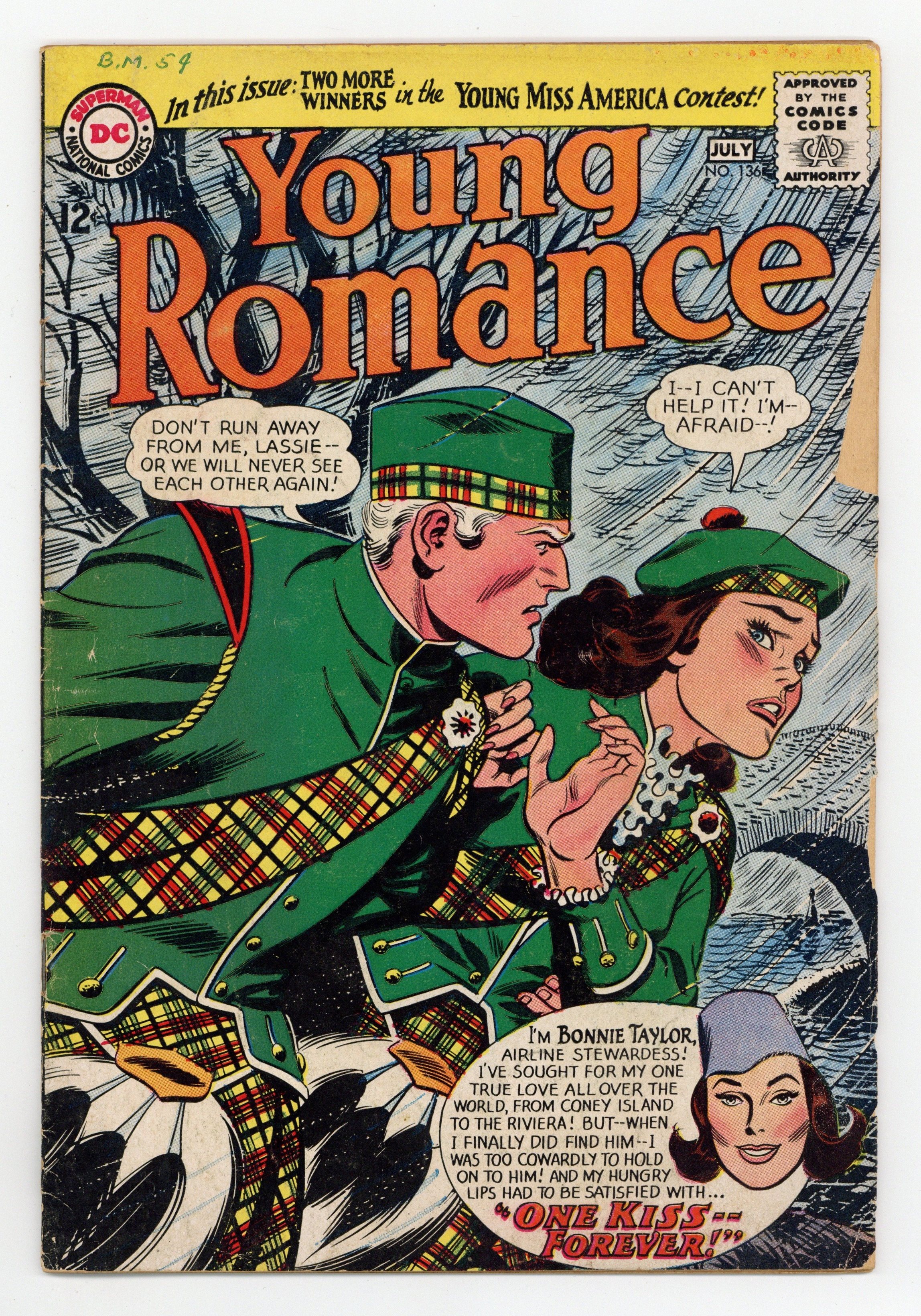 Cover by John Romita, Sr. Stories by Robert Kanigher and unknown. Art by John Romita, Sr., Werner Roth, Bernard Sachs and unknown. Bonnie Taylor has a strange experience in Scotland where she seems to meet a man from a legendary village that only appears every hundred years in "One Kiss -- Forever!" Plus: When Billy tells Lana he doesn't want to marry her, she vows to change whatever she has to change about herself to make him change his mind in "Please -- Try, Try, Try to Love Me!" Also: Jan awakens in a hospital with amnesia. After returning home with her aunt, she discovers that she had been in love with Simon Walker and he wants her back. She suddenly remembers that she saw him kiss another girl, which caused her to drive away recklessly and get into an auto accident, but he promises that she is the only girl for him in "Love Me Again!" And: Laura Penn...Your Romance Reporter letters page (2 pages). 32 pages, full color. Cover price $0.12.