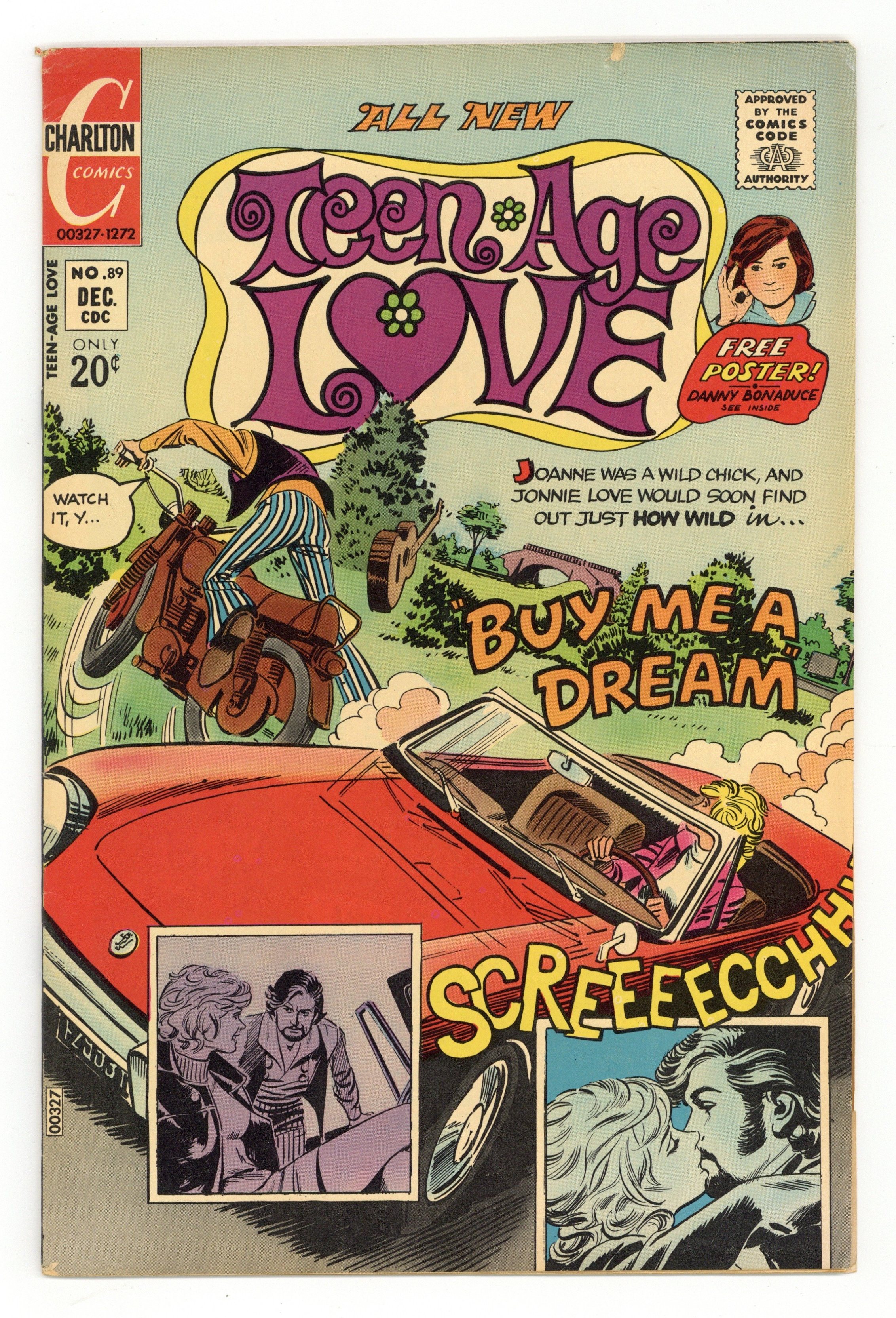 Published Dec 1972 by Charlton Comics Group.$8.00Cover by Jose Luis Garcia-Lopez. Stories and art by Jose Luis Garcia-Lopez, Charles Nicholas and Vince Alascia. Charlton's long-running romance comic coincides with the blossoming of America's teen culture from the 1950s to the 1970s. Gerard's duplicity makes Sharon promise to swear off men, but then she meets Edgar, who seems a perfect gentleman. Charlton's romantic hippie hero, Jonnie Love, gets involved with fast-driving "wild chick" Joanne after she runs his motorcycle off the road, in a story with early art by future DC artist Jose Luis Garcia-Lopez. Plus a pin-up of Danny Bonaduce, child star of The Partridge Family. A Long Lonely Week-End; Tame That Tiger; Teenage Troubles; Jonnie Love: Buy Me a Dream. 32 pages, Full Color. Cover price $0.20.