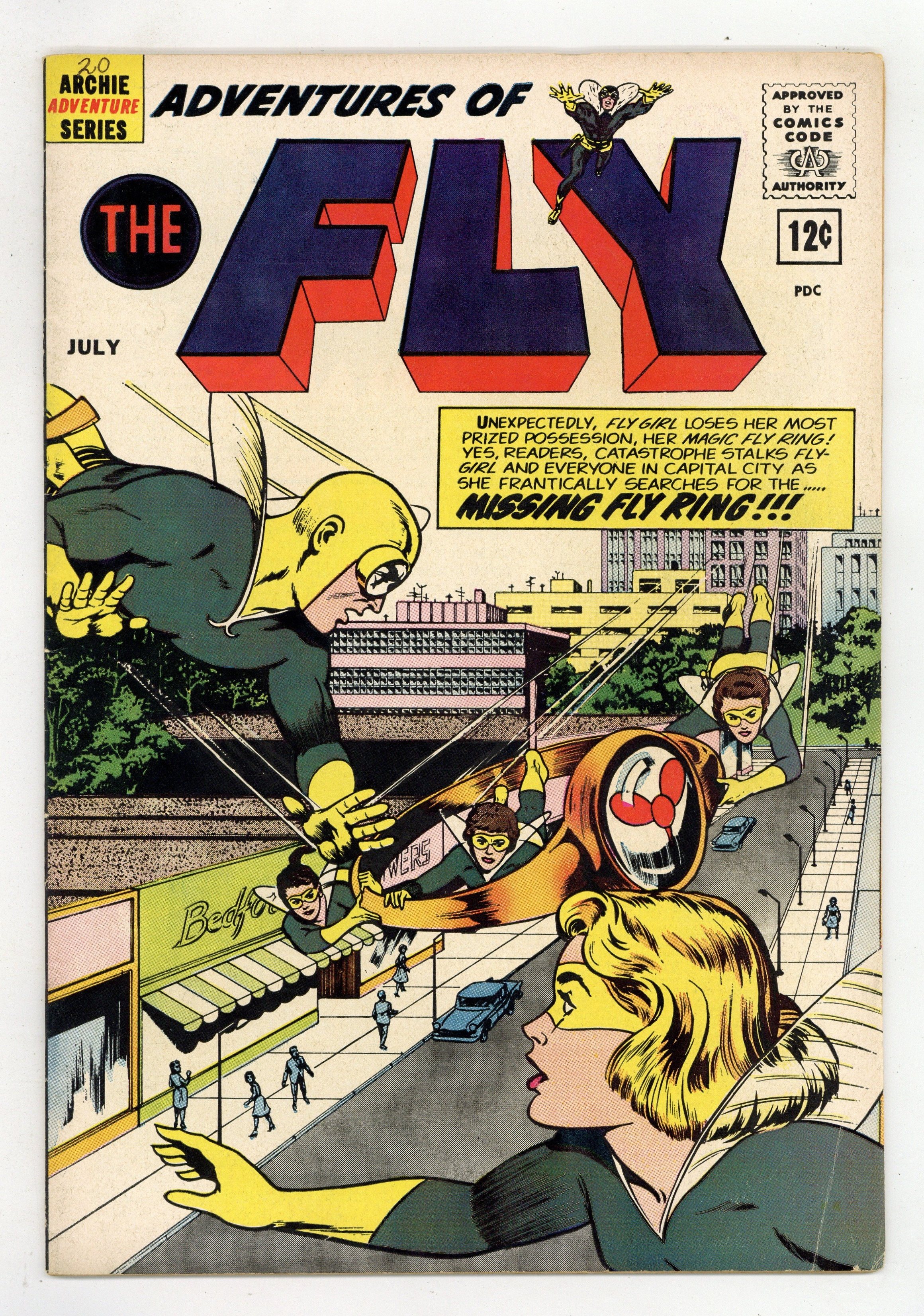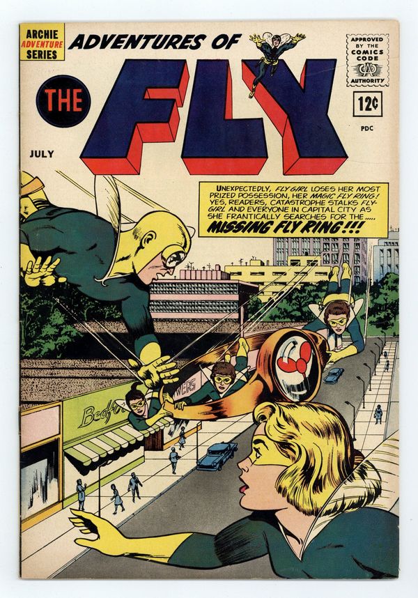 Published Jul 1962 by Archie Publications.$18.75Edited by Victor Gorelick. Cover by John Rosenberger. Stories by Robert Bernstein and John Rosenberger. Archie Comics amiable and agile super-hero The Fly battles an assortment of nefarious villains. Plus, Fly Girl loses her Fly Ring. 36 pages, full color. $0.12. Cover price $0.12.