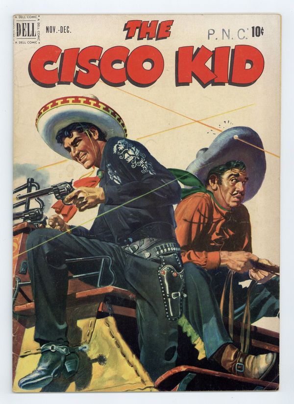 $16.00Painted cover by Ernest Nordli. Stories by Don Segall. Art by Bob Jenney. The Cisco Kid rode the range as the Robin Hood of the Old West with his corpulent sidekick Pancho, earning a permanent place in 20th-century pop culture. Cisco and Pancho try to help Susan, who has inherited her uncle's Two-Circle-R ranch. But outlaws who want the Two-Circle-R scheme to force her to sell. While trying to stay out of the way, Pancho is targeted by the very horse thieves that Cisco is tracking. Plus fun facts about vaqueros and white-tail deer. Vaqueros Below the Rio Grande; The Secret of the Two-Circle-R; The Long Ropers; Warfare on the Range; Range Hazards. 32 pages, Full Color. Cover price $0.10.