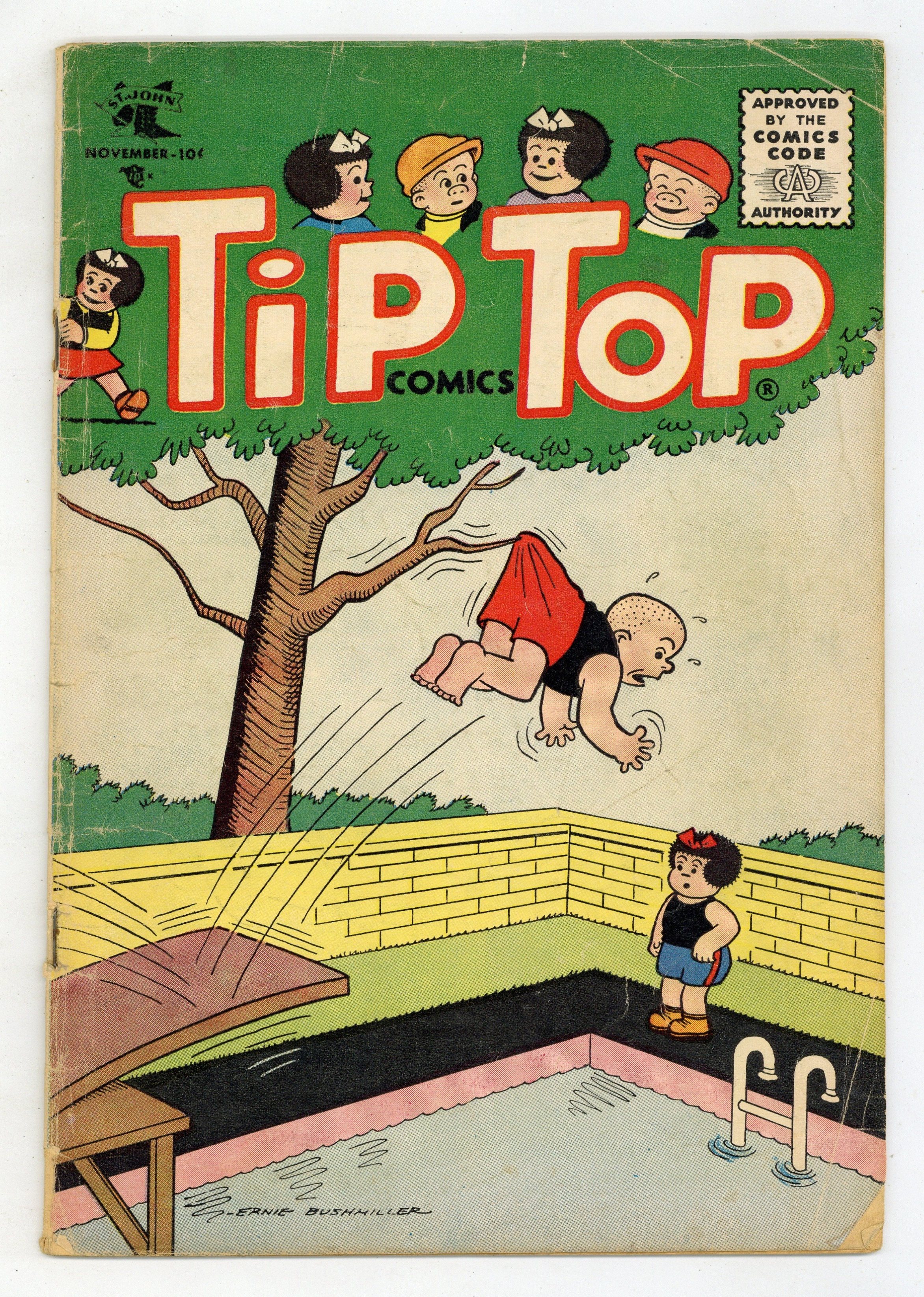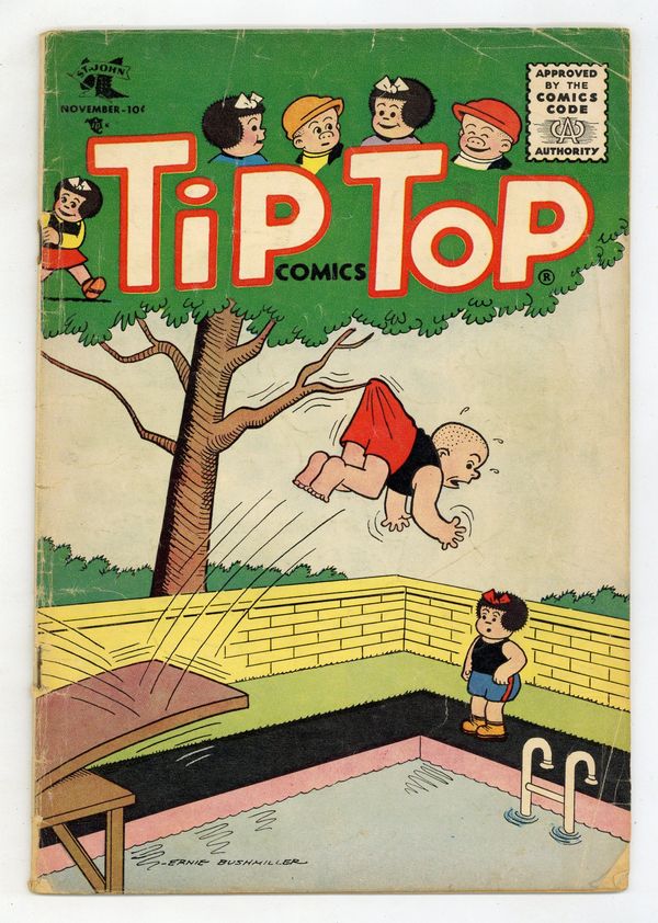 Cover by Ernie Bushmiller. Stories and art by Charles Schulz, Ernie Bushmiller, and Rudolph Dirks. Tip Top Comics presented color reprints of United Features newspaper comic strips. One of the backup strips in the comic is Charles Schulz's Peanuts, then only in its sixth year; several daily strips are presented in full color. Charlie Brown debates whether he prefers to be alone or in a crowd. Violet and Lucy compare a runaway ball to Charlie Brown's head. Bingo the Monkey Doodle Boy tries to join a gym. The Family Workshop; Nancy; Peanuts; The Captain and the Kids; Bingo. 32 pages, Full Color. Cover price $0.10.