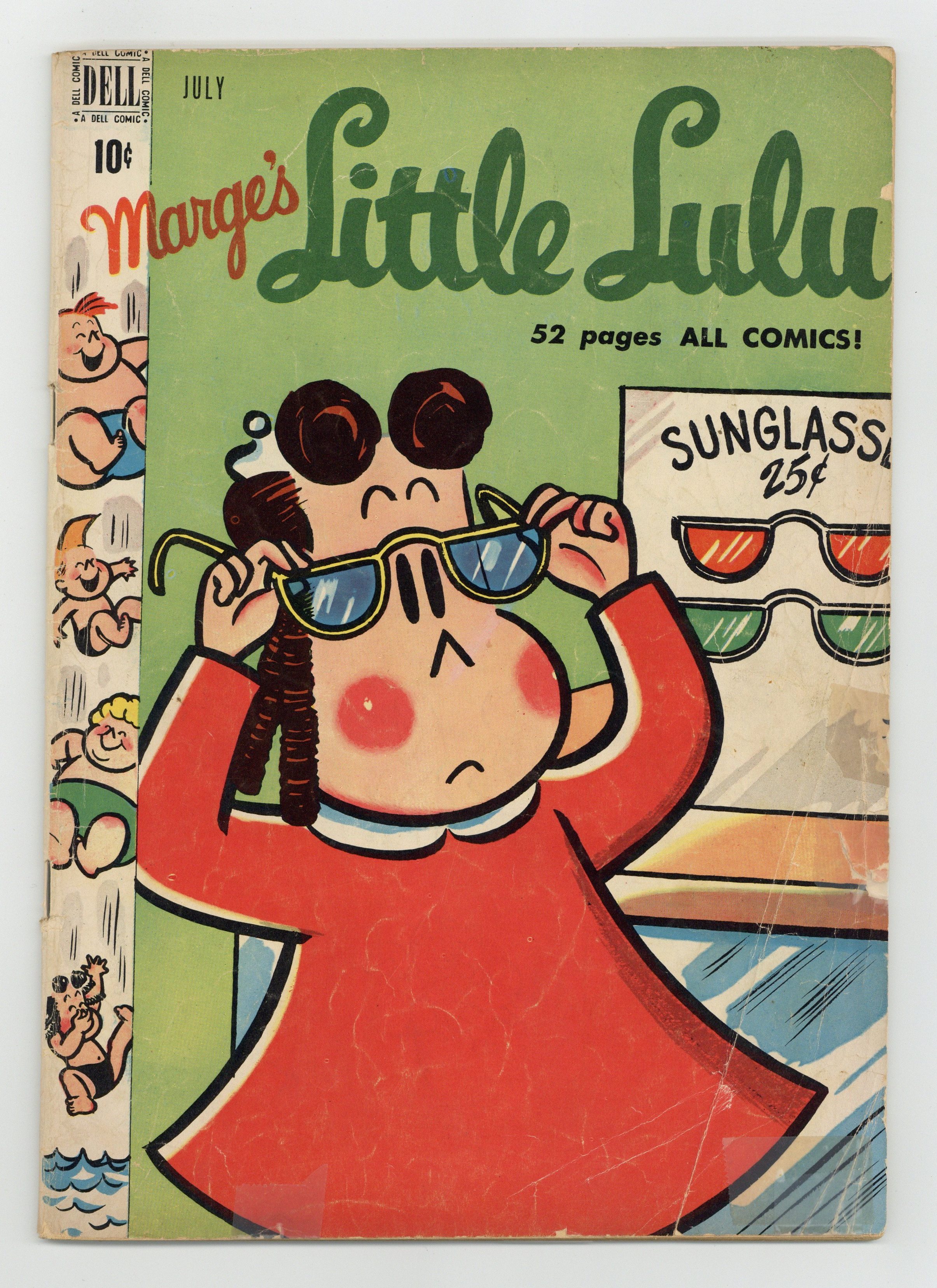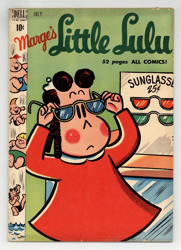 Cover art by Irving Tripp. The Dragon Tamer; Lulu tells Alvin about the girl who searched for the dragon that kidnapped her parents; First "witch" story, not called Hazel yet. The Fuzzythingus Poopi; Lulu finds a very rare flower that a collector wants at any cost. At the Beach; Lulu hopes Alvin will stay out of trouble at the beach. The Savage Seven; Tubby has to fool the Fellers so they will let him back into the club. The Date; Lulu meets Tubby at the movies, and he empties the popcorn machine. All scripts by John Stanley, art by Irving Tripp. Two-page text story, Lulus Diry ("Diary"). Back cover has advertisement for Dell Comics Club. 52 pages, full color. Cover price $0.10.