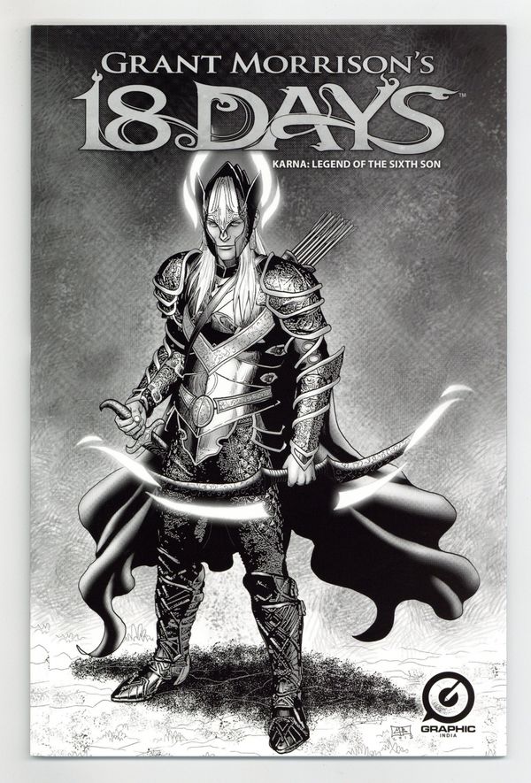 Published Mar 2019 by Graphic India.$8.00Limited Edition Battle Armor variant cover. Written by Sarwat Chadda. Art and Cover by Marc Borstel. 18 Days returns with this self-contained one-shot story which is the perfect jumping on point for any new reader into the 18 Days universe. Karna, the dark hero of 18 Days, is unleashed by King Duryodhana to force all nations to bow before him. Countless of kings have already taken the knee but one kingdom remains defiant and Karna, scion of the sun god and warrior without peer, promises to conquer it… alone. Yet this may be one conquest too far, for this is a kingdom not of men but of monsters, ruled by the dread demon king, Jarasandh. One mortal against a city of demons. Certain death to anyone... anyone but Karna. 48 pages, PC/PB&W. Cover price $3.99.