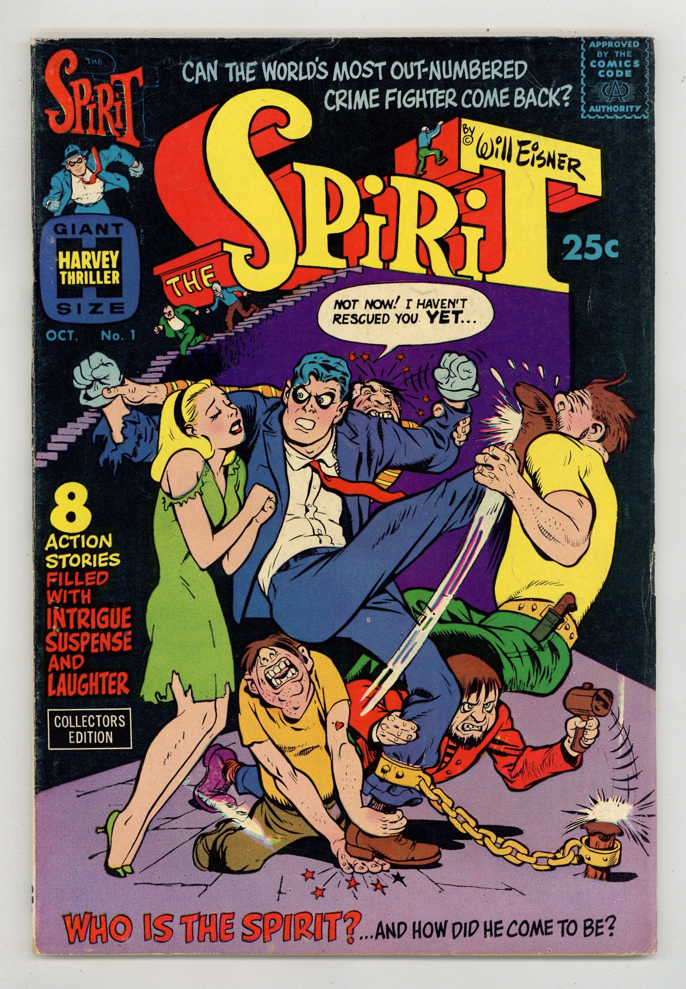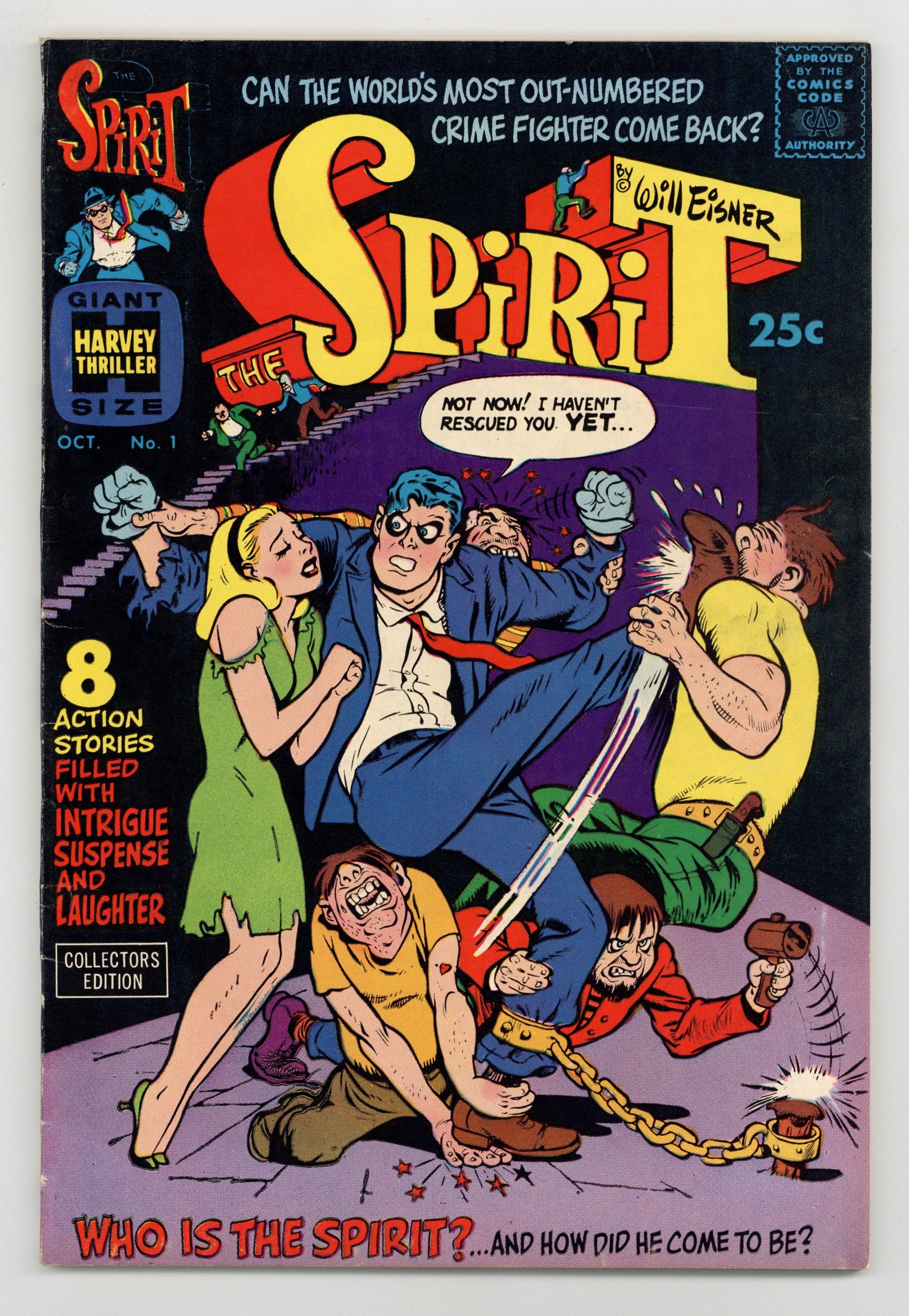 Stories and art by Jules Feiffer, Marilyn Mercer, Chuck Kramer, and Will Eisner. Cover by Will Eisner. Harvey's short-lived revival of Eisner's beloved strip nevertheless introduced his influential work to a new generation of fans, including many artists, writers and fandom organizers. Seven classic 1948–1949 Spirit stories are reprinted. Plus a new seven-page retelling of the Spirit's origin by Eisner and Chuck Kramer. New material includes the cover; "An Interview With the Spirit" by Eisner's office manager Marilyn Mercer; Eisner's two-page featurette "Spirit Lab: Invincible Devices"; and a story (and color work) by Eisner's assistant Jules Feiffer, who went on to comics fame of his own. Origin of the Spirit (Version 3); An Interview With the Spirit; Lorelei Rox; Two Lives; Spirit Lab; Agent Cosmek; The Story of Rat-Tat the Toy Machine Gun; Ten Minutes; Thorne Strand; Gerhard Shnobble. 68 pages, full color. Cover price $0.25.