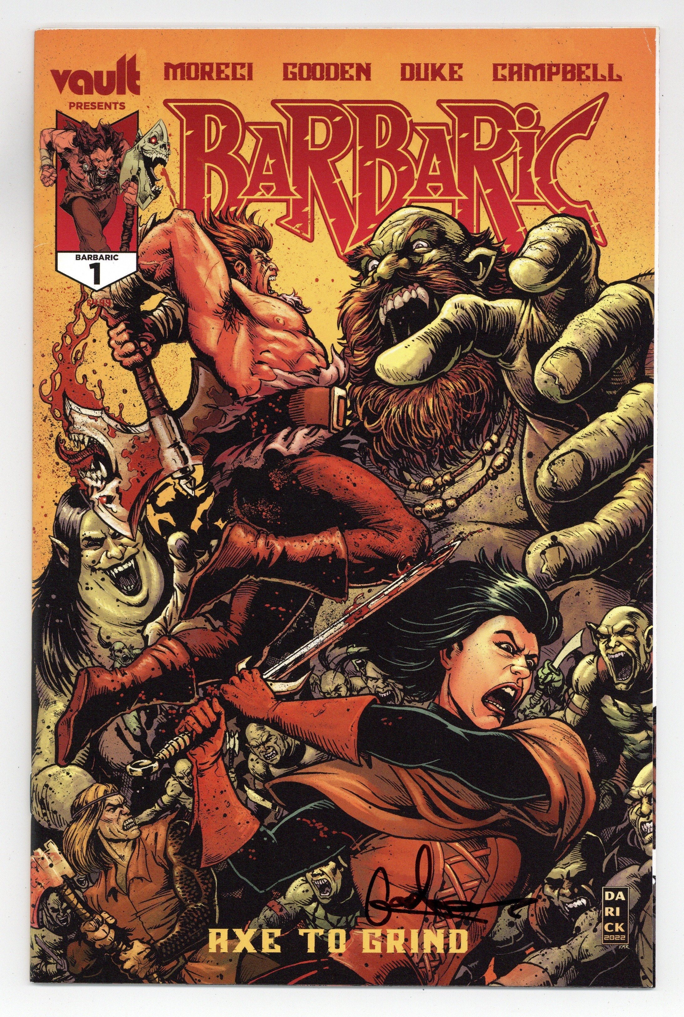 Limited 1 for 100 Retailer Incentive Variant Cover. Written by Michael Moreci. Art by Nathan Gooden. It's the moment we've all been waiting for - the start of an all-new arc of BARBARIC! Follow Owen and his magical companion, the tender, talking Axe as they spread kindness and hope in a world gone bad...just kidding! Owen, Axe, and Soren are back, and so is all the mayhem and bloodshed that follows them wherever they go! This time, they're out to settle an old score against Gladius, a wicked a$$hole who did Owen wrong way back in his barbarian days. As always...it's just f***ing barbaric. 32 pages, full color. Cover price $4.99.