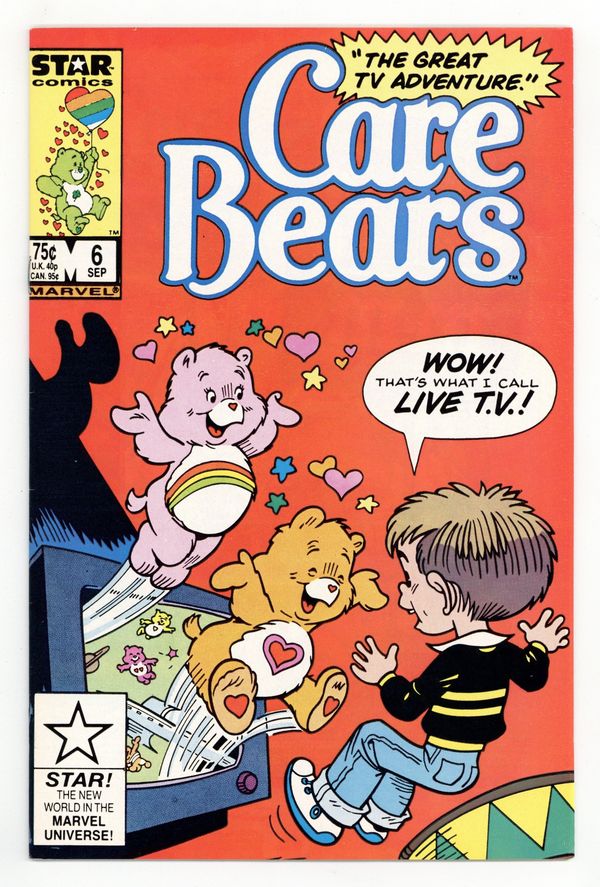 Published Sep 1986 by Marvel/Star Comics.$15.00Join the Care Bears in their magical home, the incredible land of Care-A-Lot. In this issue, when the Care Bears see young Jacky sad and upset because his idol, Billy Bangtail, the kid cowboy and star of "Cactus Trail," ignored him, they resolve to help Jacky. But the problem is Billy Bangtail is a rotten kid and the Care Bears need to help him in "The Great TV Adventure" and "A Star is Reborn." Script by Howard Post and art by Howard Post & Roberta Edelman. Cover price $0.75.