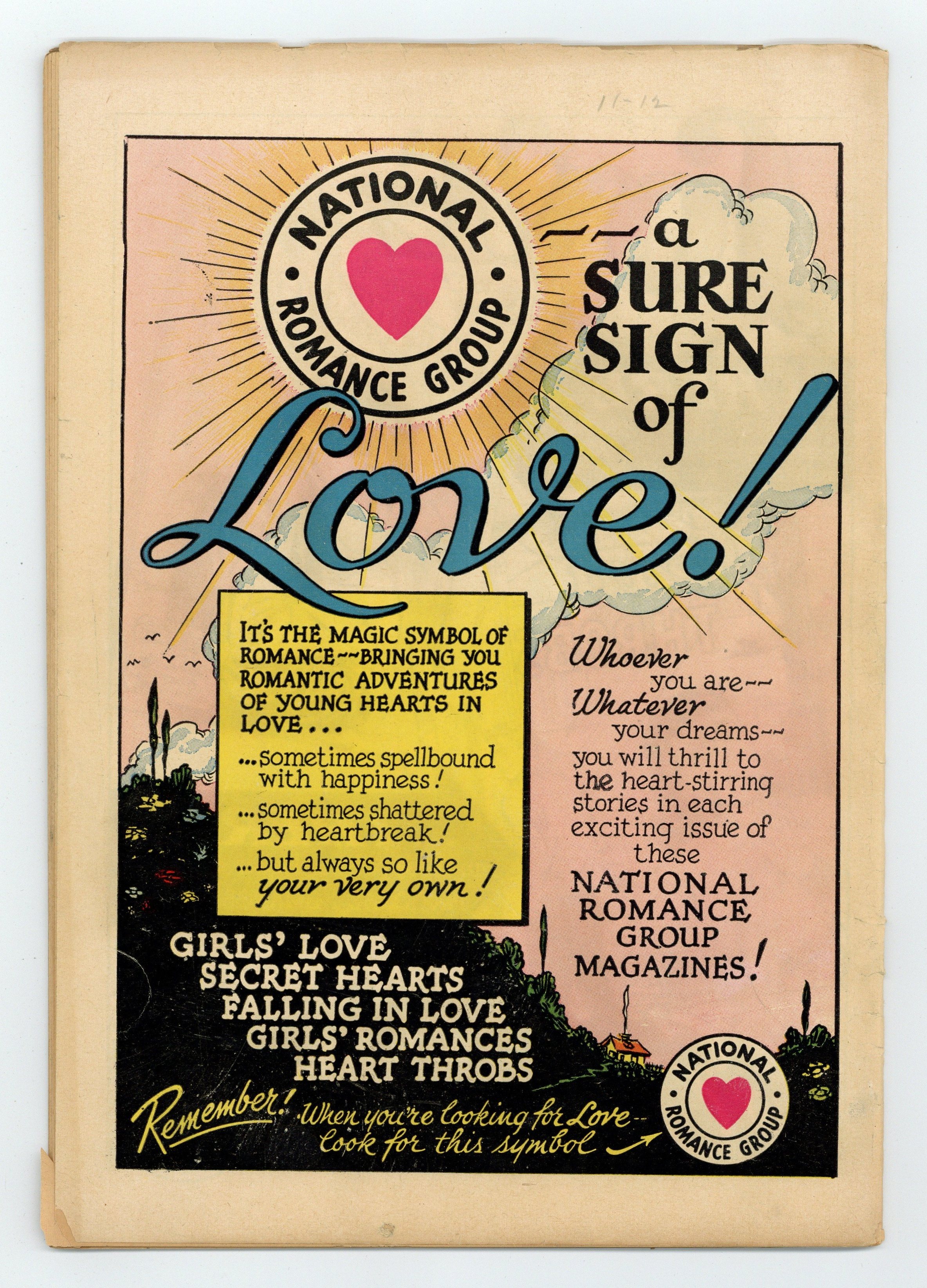 Stories by unknown. Art by Tony Abruzzo, John Forte, Mike Sekowsky, Bill Draut, Bernard Sachs and unknown. She saw Gene staring at the other woman with a look that she thought was hers alone...and she knew it would never be hers again. The ache in her heart told her it was..."Love's Last Look"! Also in this issue: "A 'Princess' Looks for Romance" with art by Tony Abruzzo and Bill Draut; "Never Trust in Love!" with pencils by John Forte; "Listen to Love!" with art by Mike Sekowsky and Bernard Sachs; and 2-page To You...From Carol Andrews letter column. 32 pages, full color. Cover price $0.10.