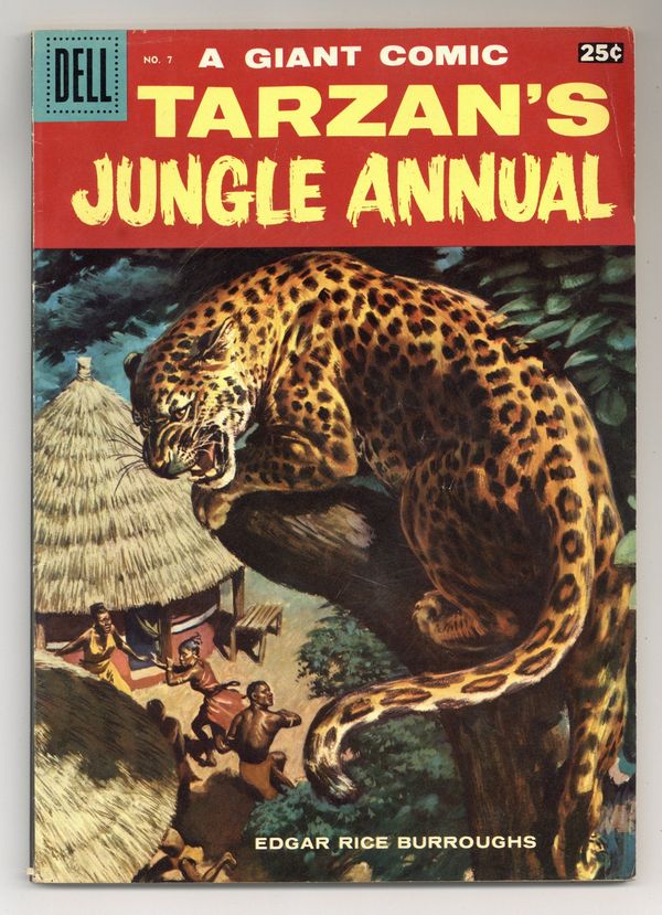 $16.00Version with Juicy Fruit Gum ad on back cover. The Baboon Tarzan's Jungle World illustration by Jesse Marsh. "War in the Desert," script by Gaylord Du Bois, art by Jesse Marsh; Tarzan and his family, along with the wounded pilot, Johnny Ball, find themselves in a lost city in the desert as that city goes to war. "Tarzan and the Great Animal Trainer," script by Gaylord Du Bois, art by John Ushler; Kobo trains one zebra to pull a cart and another for Boy to ride. Help Build a Ladder activity page, art by Tony DiPaola. "Moonbeam and Shadow," script by Gaylord Du Bois, art by Jesse Marsh; When a storm causes their burrow to be flooded, a mongoose family must go adventuring before finding a new home. Birds of Tarzan's Jungle filler page. "Tarzan and the Axe Man of Jalur," script by Gaylord Du Bois, art by Jesse Marsh; Tarzan assist Kandor of Jalur in his quest for a rhinoceros horn that will entitle Kandor the Jaluran throne. "Jane and Kimbo's Machine," script by Gaylord Du Bois, art by Jesse Marsh; Jane arranges for a couple to become weavers. Jungle Thanksgiving. "Boy Braves a Siege by Lions," script by Gaylord Du Bois, art by Russ Manning; Boy and Dombie rescue a lost boy from leopards and lions. "Tarzan and the Bridge to Life," script by Gaylord Du Bois, art by Mike Arens; Tarzan rescues Nogoni and Ila from their pursuers who plan to kill Nogoni and enslave Ila. Jungle Scarecrow filler page. "Tarzan's Ape-English Dictionary," art by Tony DiPaola. The Klipspringer Tarzan's Jungle World illustration by Jesse Marsh. Tarzan and Monkey illustration by Jesse Marsh. 100 Pages, Full Color. Cover price $0.25.