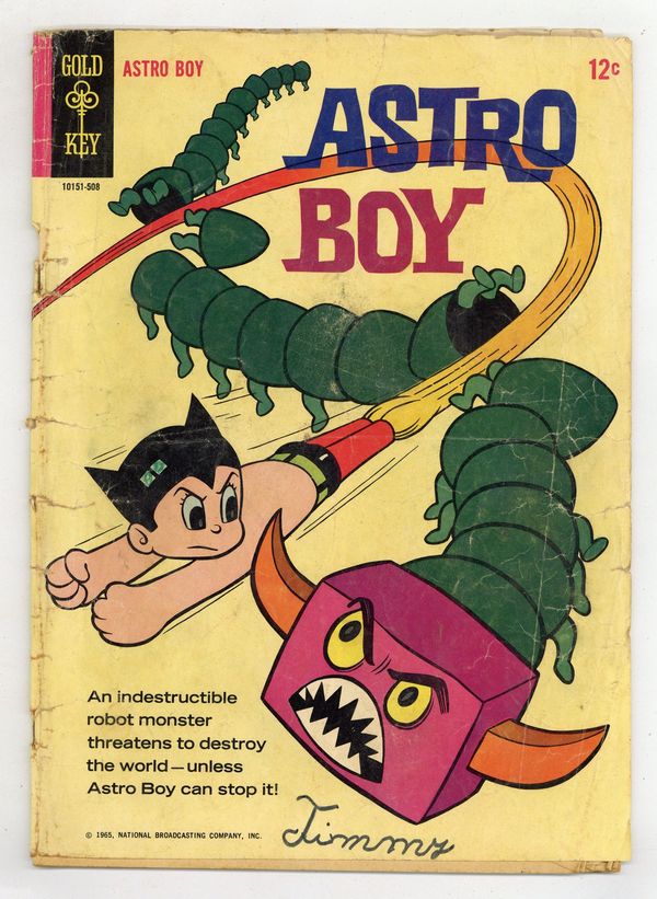 10151-508. 1st comic book appearance Astro Boy. "Gangor the Monster," script by Fred Fredericks (?); An indestructible, centipede-like monster threatens to destroy the world—unless Astro Boy can stop him. "Attack of the Mud People," script by Fred Fredericks (?); Astro Boy battles Mud People. Astro Boy pinup on the back cover, same as the front minus the lettering. 36 pgs., full color. Cover price $0.12.