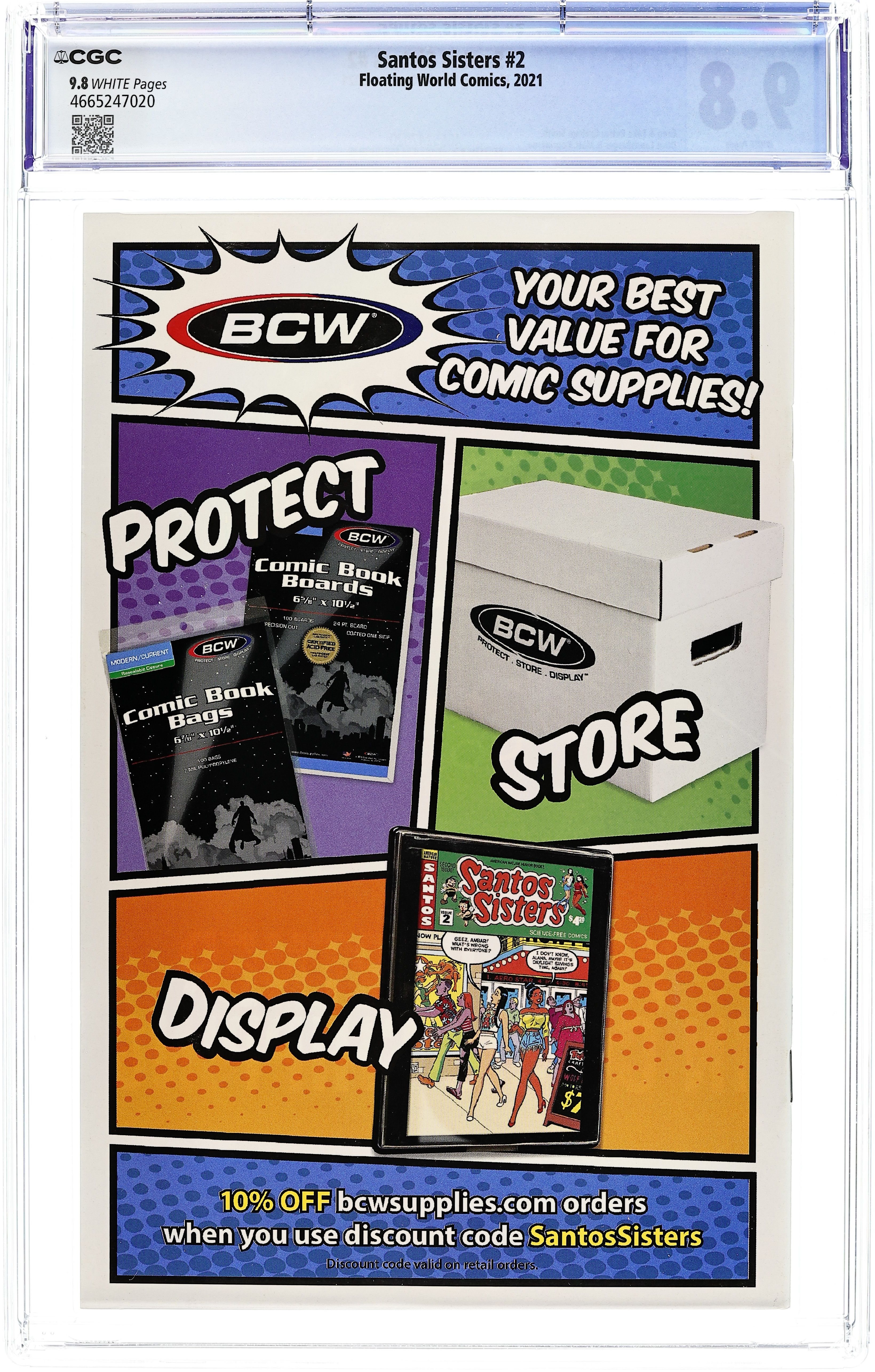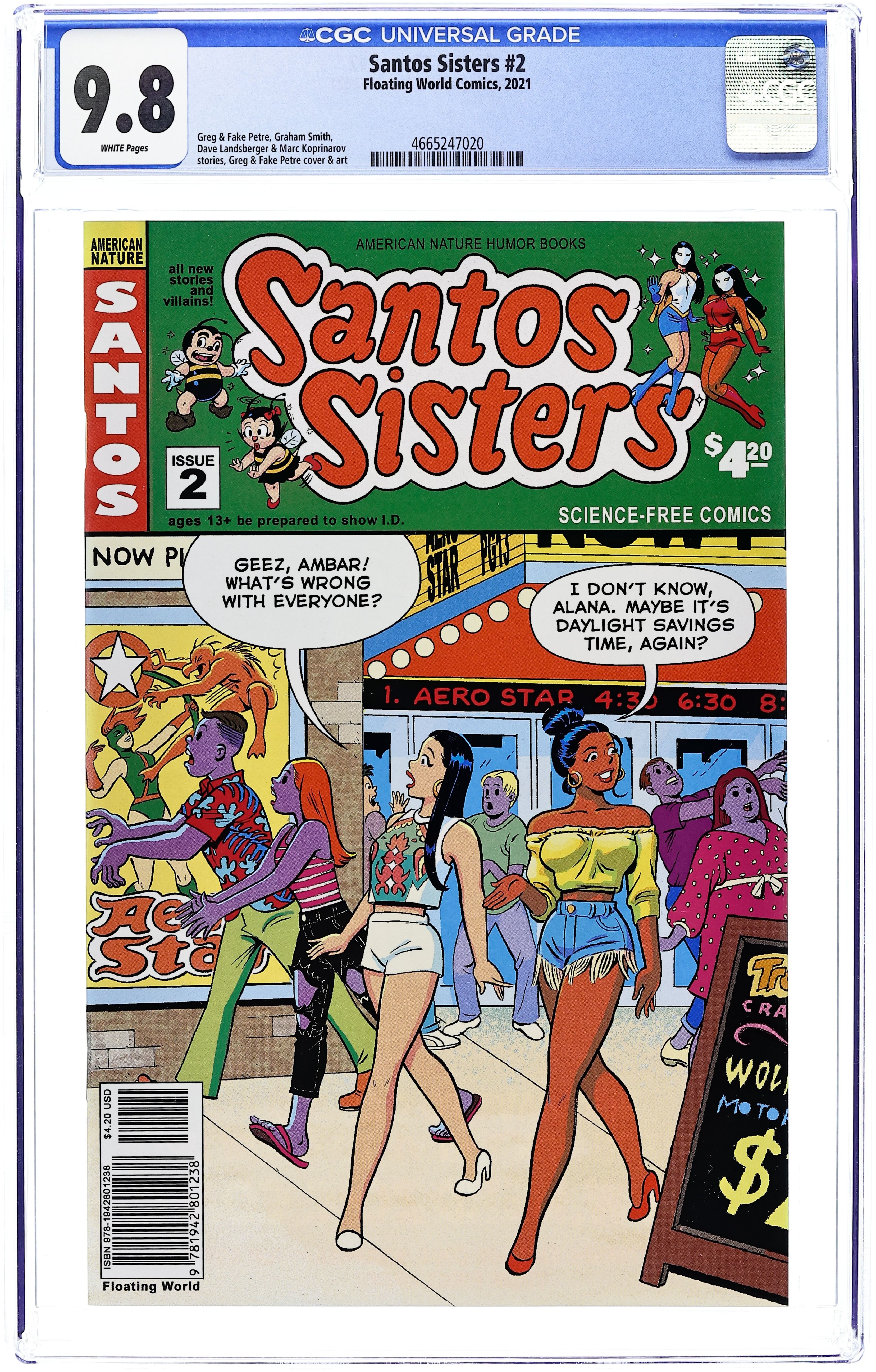 Written by MARC KOPRINAROV. Art by GREG and FAK. What do a pair of deadly assassins, three roided-up high school football players, a zombie outbreak, and a cute dragon all have in common? You can find them all in the pages of Santos Sisters! Once again printed in full-color on your favorite decadent newsprint! 32 pages, full color. Cover price $4.20.