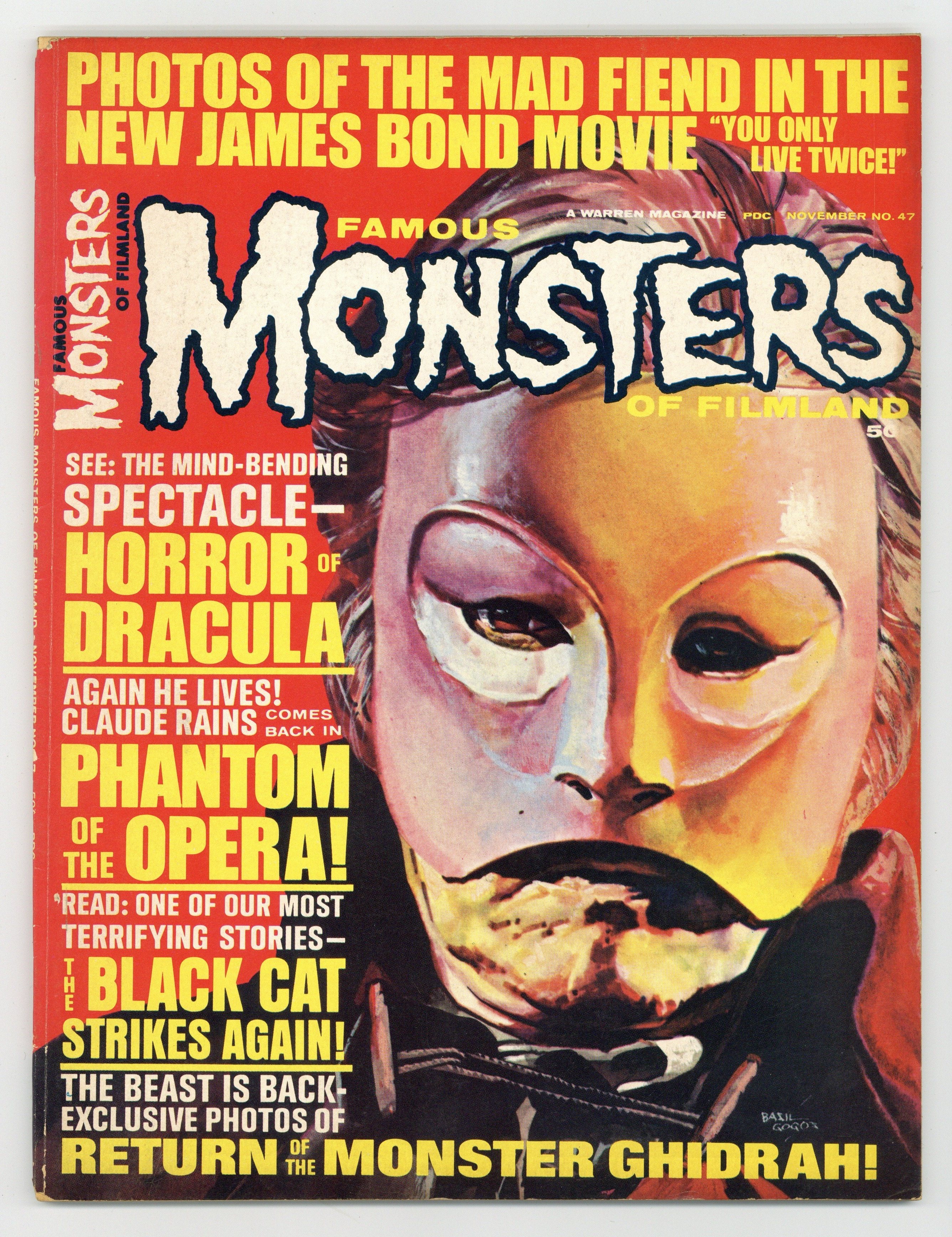 Features in this issue include: "Return of the Phantom" (about the less than stellar Claude Rains version of Phantom of the Opera); a Claude Rains obituary; a preview of James Bond film You Only Live Twice; a feature on black cats in films; and more. Highly realistic Basil Gogos cover painting of Claude Rains as The Phantom. Cover price $0.50.