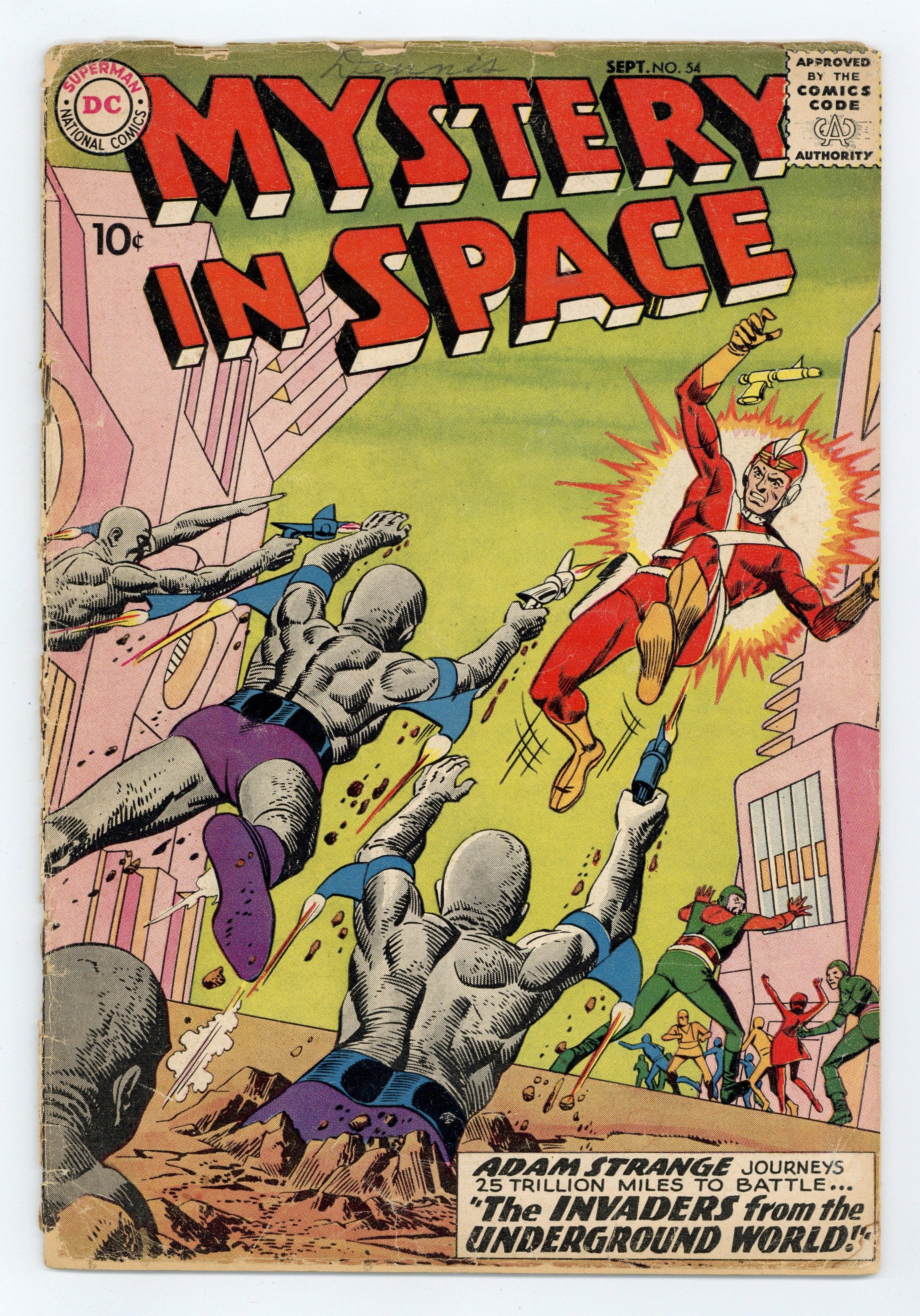 Adam Strange stars in "Invaders of the Underground World!" (pencils by Carmine Infantino); "Amazing Ark of Space!" (pencils by Sid Greene?); and "Riddle of the Counterfeit Earthmen!" (pencils by Gil Kane). Kane cover pencils. 36 Pages, Full Color. Cover price $0.10.