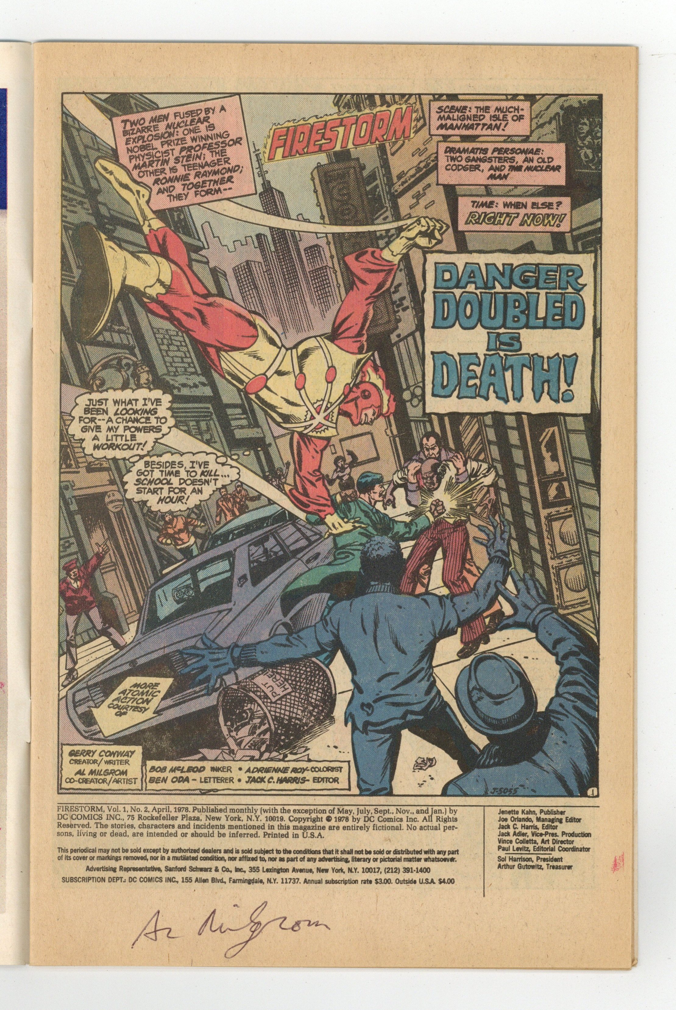 Starts Mar 23 Superman guest stars in "Danger Doubled is Death." The nuclear accident that created Firestorm also effects Danton Black, who becomes Multiplex, a super-villain who can duplicate himself. Script by Gerry Conway, pencils by Al Milgrom, inks Bob McLeod. Cover by Milgrom. Cover price $0.35.