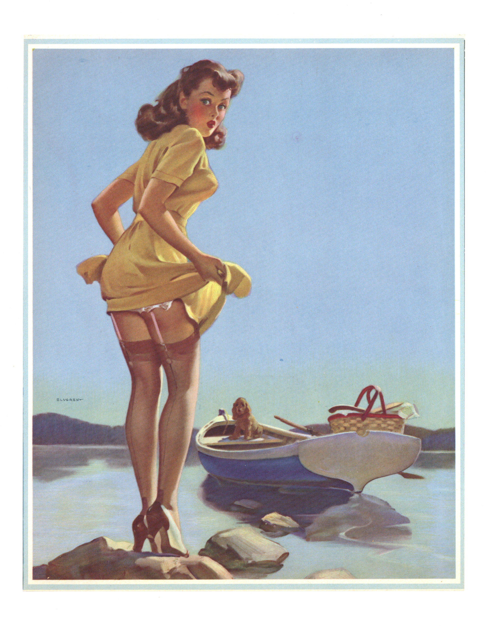 $25.001944. Gil Elvgren pin-up art of a young lady in a yellow dress. 8.5" x 11", 1 page, full color.