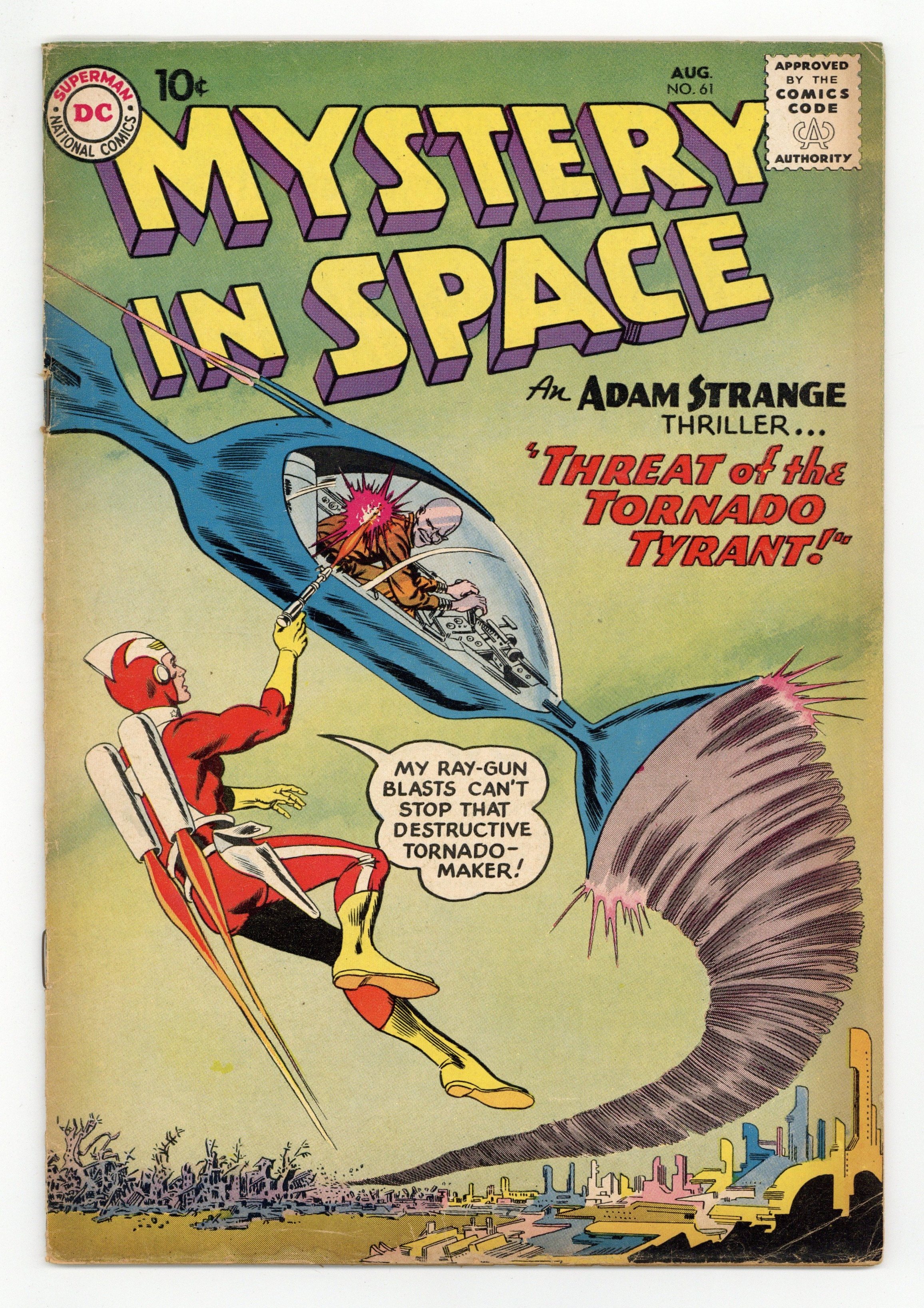 Adam Strange stars in "Threat of the Tornado Tyrant!" (pencils by Carmine Infantino). Back-up stories: "The Sleeping War!" (pencils by Gil Kane) and "Escape From Earth!" (art by Murphy Anderson). Kane cover pencils. 36 Pages, Full Color. Cover price $0.10.