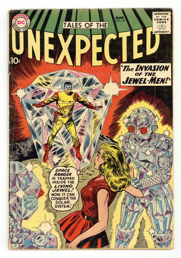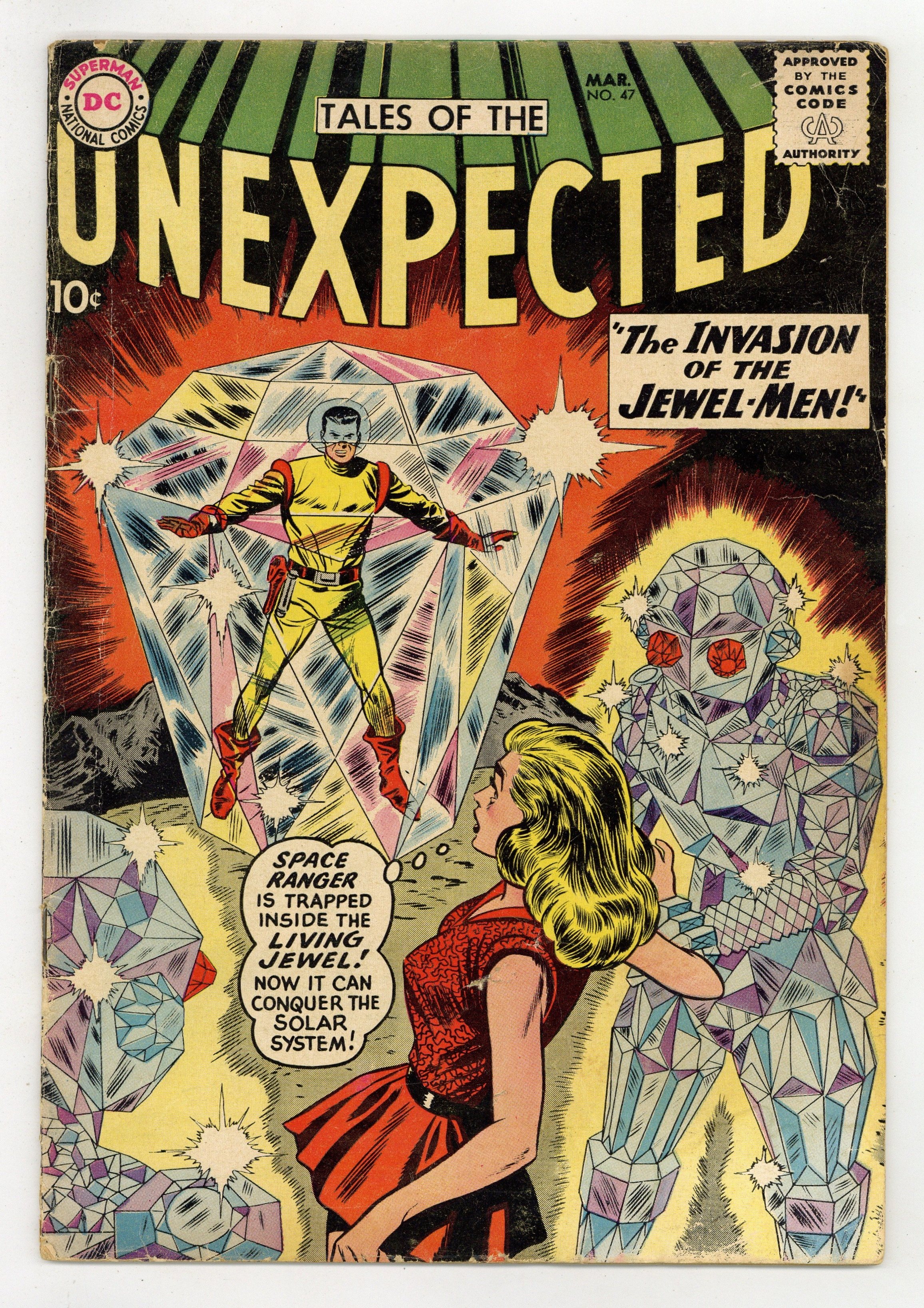Cover pencils by Dick Dillin. The Man Who Stole the Solar System, art by Nick Cardy; Captain Ambers has been brought in to handle security at the "Project Flanders," a miniature version of the solar system equipped with the "Flanders Ray."; Whatever the Flanders Ray does to the model of the universe happens to the universe itself. Buzzy's "Famous Books" Quiz public service announcement, script by Jack Schiff, art by Ruben Moreira. The Brave and the Bold #28 ad. The Crystal Ball Planet, art by Howard Purcell. Captives of the Moon Men text story. Invasion of the Jewel Men starring Space Ranger, art by Bob Brown. 36 Pages, Full Color. Cover price $0.10.