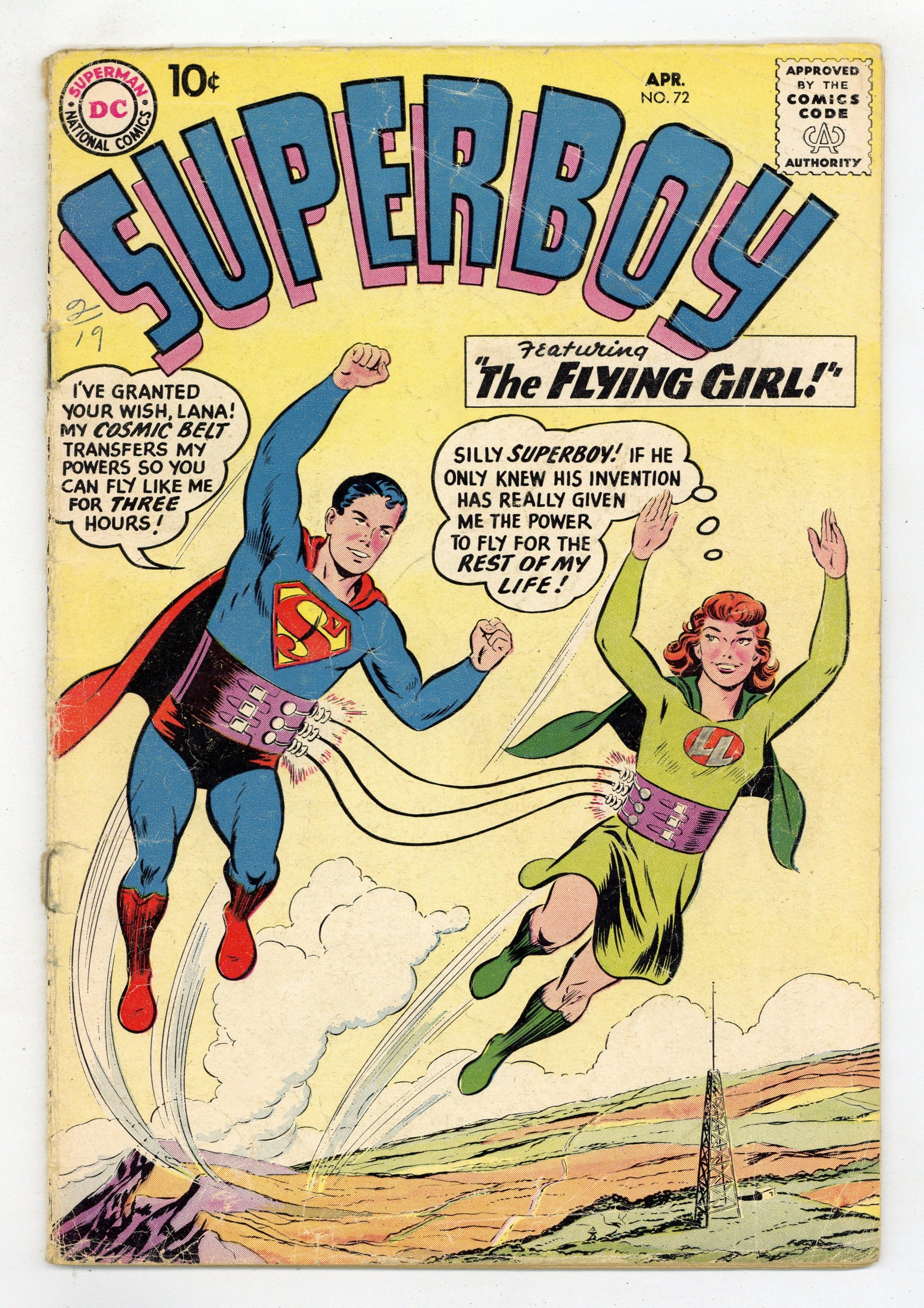 Cover pencils by Curt Swan, inks by Stan Kaye. Rebello, the Human Robot!, script by Otto Binder, art by John Sikela; Superboy builds his first robot capable of independent thought and it rebels against him. The Brave and the Bold #23 ad. What's Your B. Q.*? (*Brotherhood Quotient) public service announcement, script by Jack Schiff, art by Bernard Baily. The Day Superboy Was a Coward, script by Otto Binder, art by George Papp; Superboy loses all confidence after he apparently kills an escaping criminal. Varsity Vic humor page by Henry Boltinoff. The Flying Girl of Smallville!, script by Jerry Coleman, art by Creig Flessel; Lana Lang tricks Superboy into giving her the power to fly and, if they stay together for a continuous three hours, Lana will gain the power permanently. 36 Pages, Full Color. Cover price $0.10.