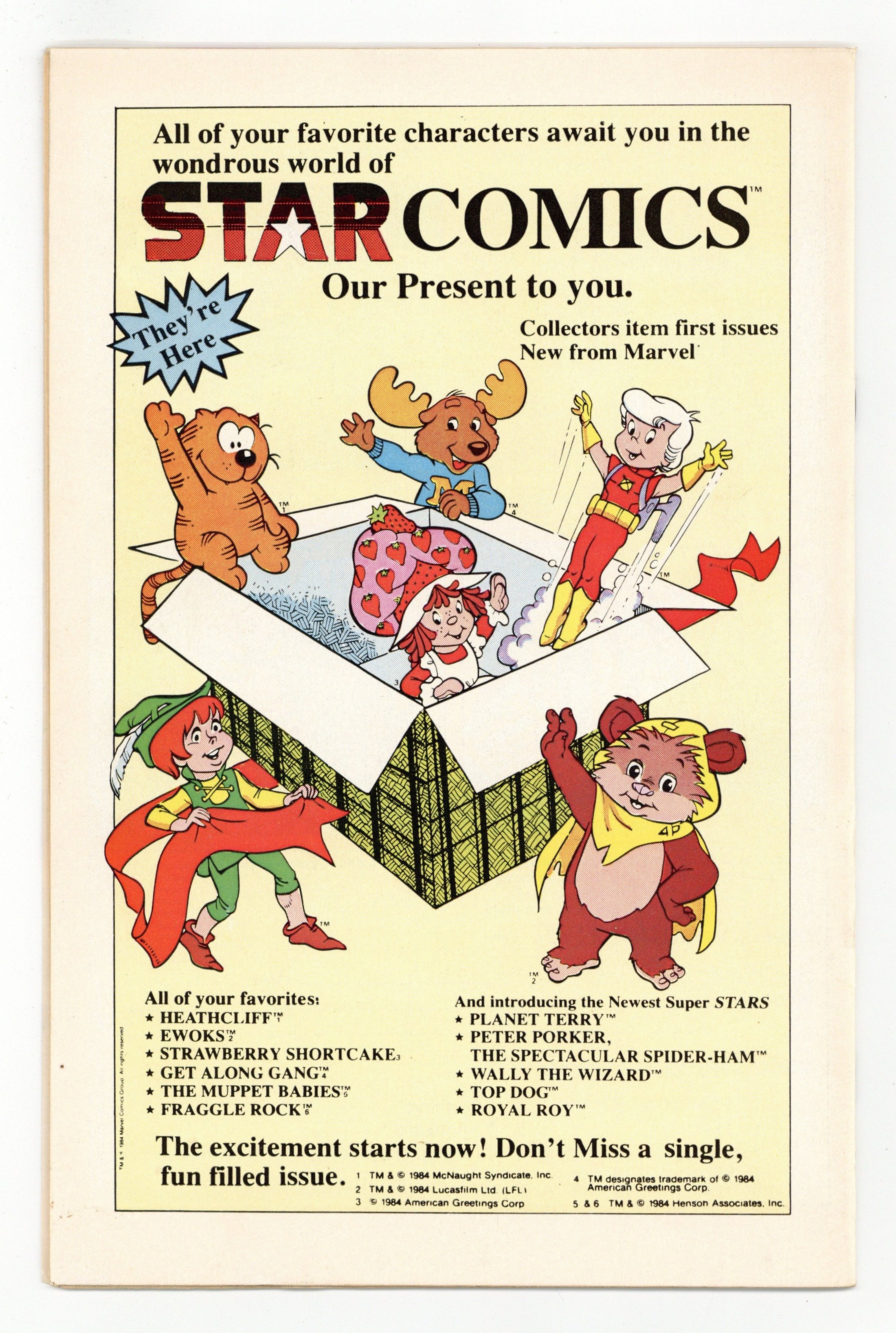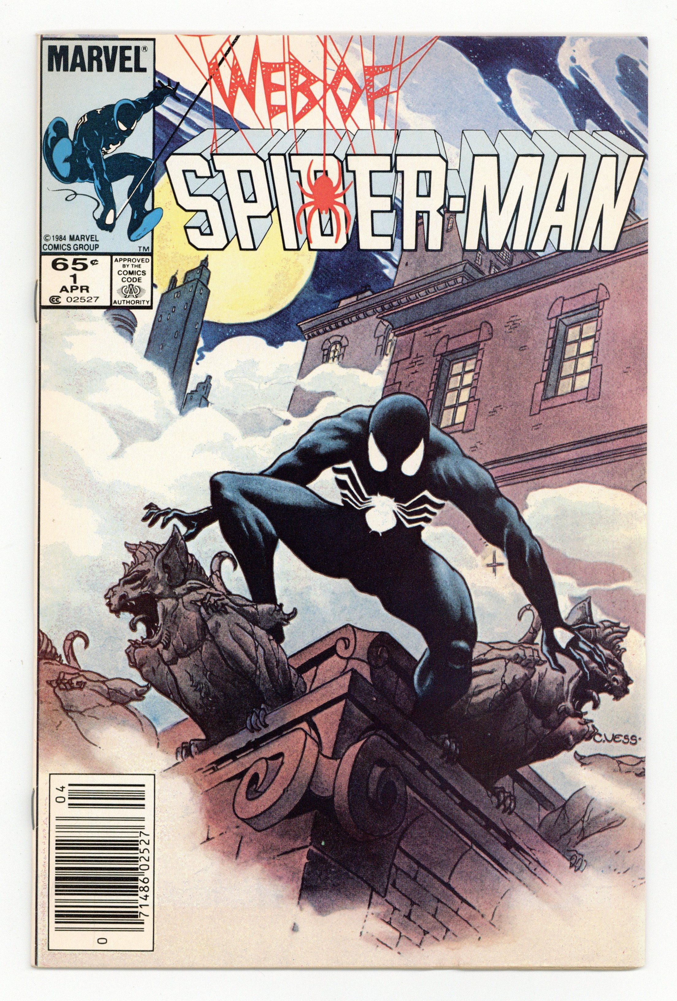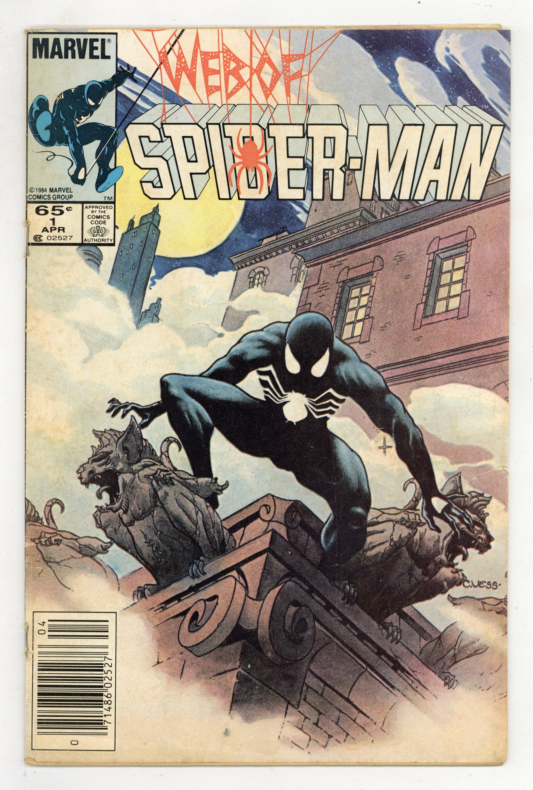 Tags: Spider-Man$15.00Newsstand Edition. "Til Death Do Us Part!" Story by Louise Simonson. Art by Greg LaRocque and Jim Mooney. Painted cover by Charles Vess. The alien symbiote (aka black costume) ambushes Peter Parker while he is getting dressed. Now Spider-Man must battle the black costume and the new Vulturions on his way to the Baxter Building! Meanwhile, Aunt May laments Peter's decision to drop out of graduate school. (Note: The Web of Spiderman series essentially replaced the Marvel Team-Up title as Marvel's third regular series featuring Spider-Man.) 32 pages Cover price $0.65.