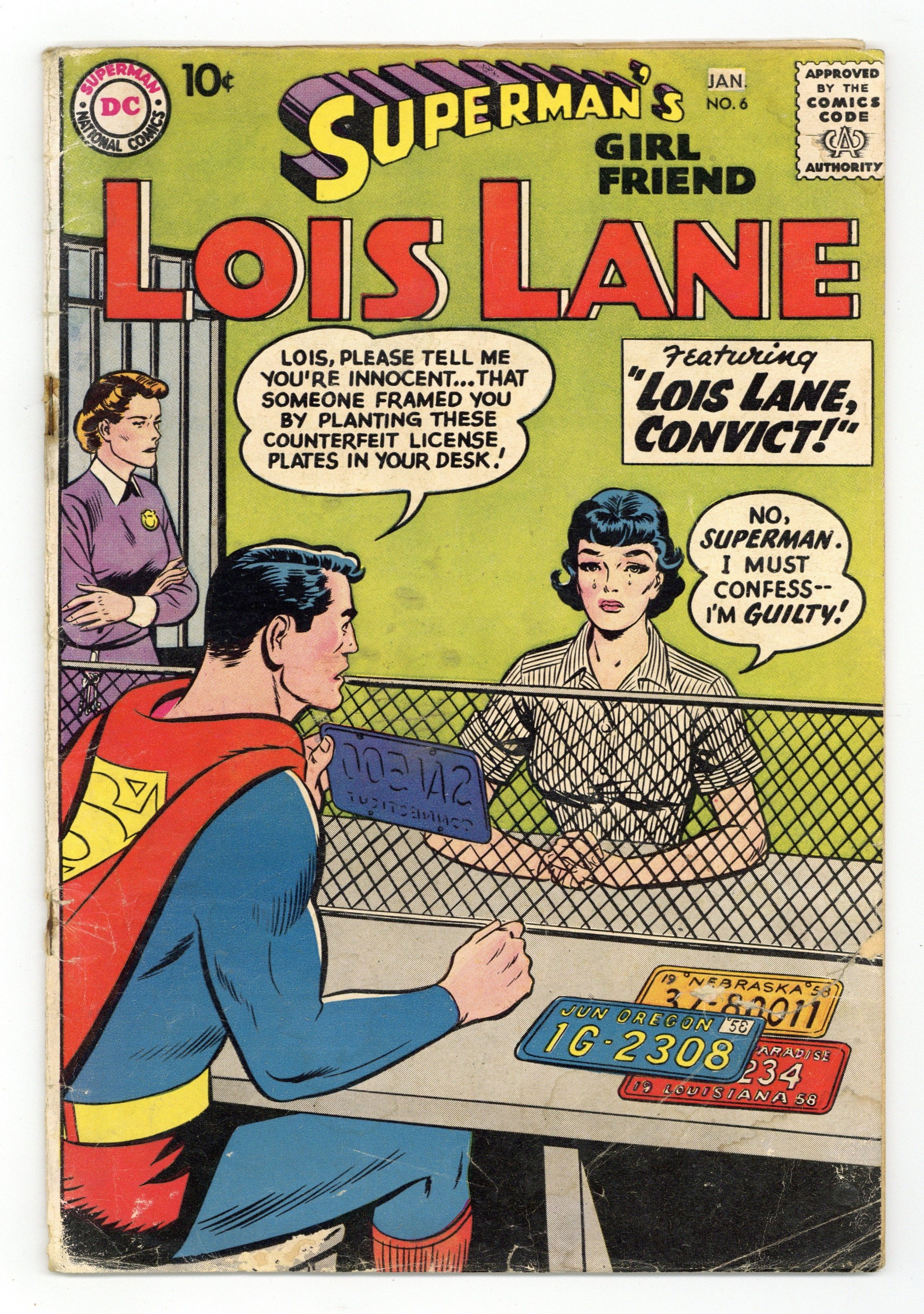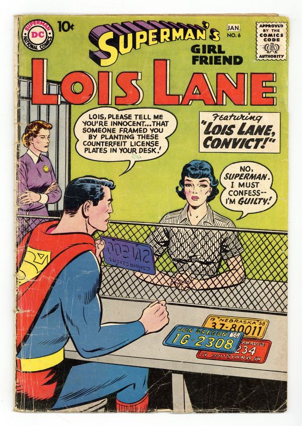 Cover pencils by Curt Swan, inks by Stan Kaye. The Amazing Superman Junior, script by Jerry Coleman, pencils by Wayne Boring, inks by Stan Kaye; Superman makes himself, Perry, Jimmy, and Robin look old in order to teach Lois a lesson, but then someone with super-powers shows up and claims to be Superman Junior. Peg humor page by Henry Boltinoff. Lois Lane – Convict, script by Bill Finger, art by Kurt Schaffenberger; Lois takes a bribe and is forced into crime by Baldy Pate. Cora the Car Hop humor page by Henry Boltinoff. Lieutenant Lois Lane, U.S. Army!, script by Bill Finger, art by Kurt Schaffenberger; Lois and Clark enlist in the Army for a month to get a story, but Lois's rank seems to go to her head, causing her to act like a bully toward everyone around her. 36 Pages, Full Color. Cover price $0.10.