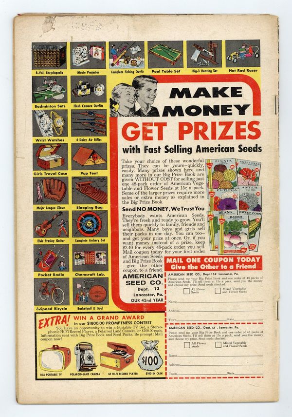 Starts Apr 27 Cover by Sheldon Moldoff. "The Dog that Betrayed Batman," script by Bill Finger, pencils by Sheldon Moldoff, inks by Charles Paris; Wounded and suffering from amnesia, Bat-Hound befriends a hermit and blind man, but hates the sight of anyone in a mask...including Batman himself! Half-page "Police Woman!" non-fiction story. Aloha... Hawaii! public service announcement, script by Jack Schiff, art by Bernard Baily. "The Case of the Deadly Gems," script by Bill Finger, pencils by Dick Sprang, inks by Charles Paris; Jeweler Claber, of Gotham Gem Company, is murdered and his death blamed on criminal Ted Greaves by the man's three partners; However, Batman discovers the partners are actually involved in a smuggling racket and seek to throw suspicion off themselves by blaming Greaves. One-page Casey the Cop story by Henry Boltinoff. "The Second Batman and Robin Team," script by Bill Finger, art by Sheldon Moldoff; Alfred tests out his new typewriter by writing an imaginary tale of Robin growing to manhood and becoming the new Batman, adopting a new partner as Robin, and taking on a gang of crooks. 36 Pages, Full Color. Cover price $0.10.
