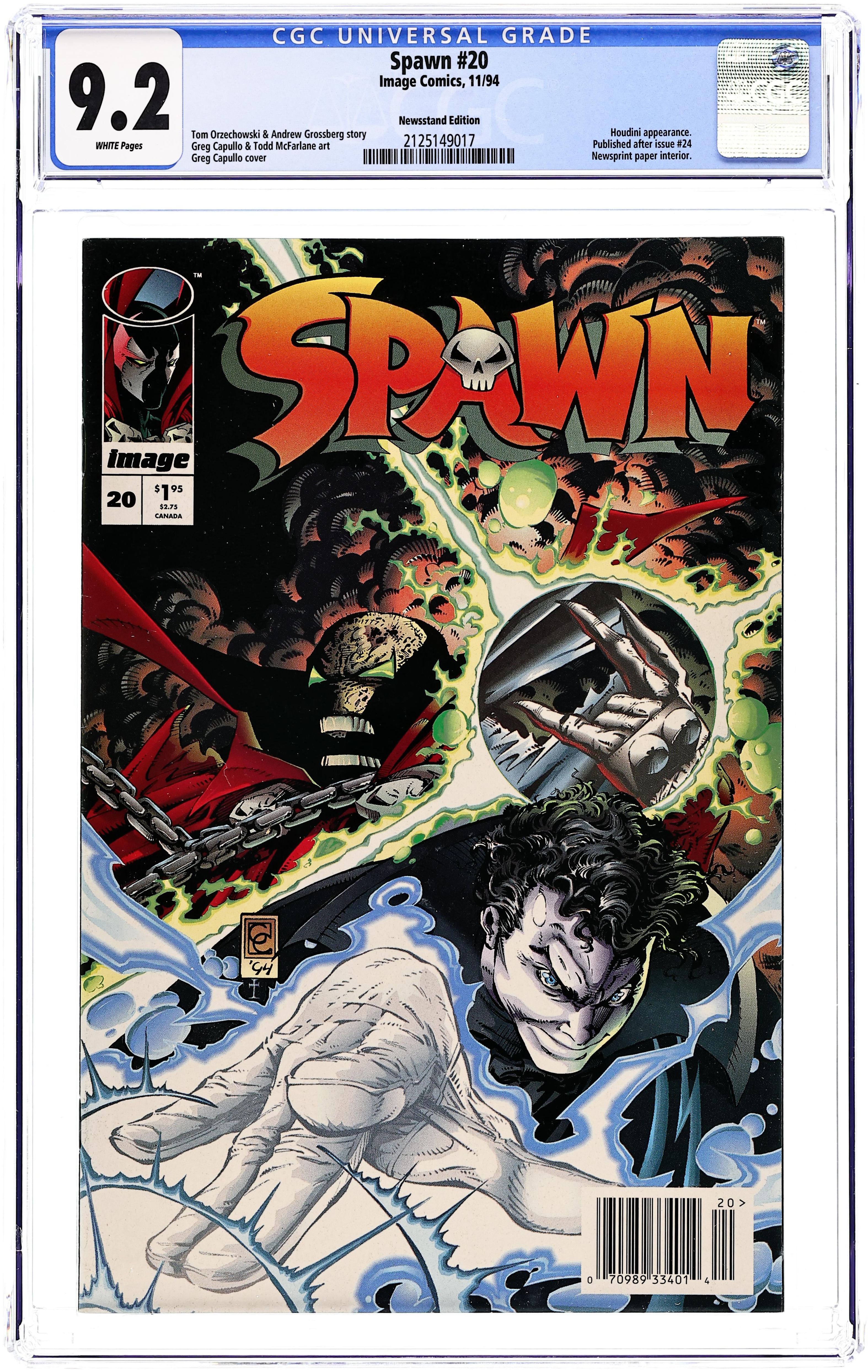 Newsstand Edition. "Showtime!" Part 2 of 2. Story by Tom Orzechowski and Andrew Grossberg. Art by Greg Capullo, Todd McFarlane, and Mark Pennington. Spawn concludes his idiosyncratic adventure with the uncanny Harry Hudini. Includes 2 Spawn pin-ups. NOTE: Issue #21-25 shipped before #20 due to a scheduling mishap. This issue includes a humorous apology from creator Todd McFarlane. - Odinson, Lone Star Comics Archivist Cover price $1.95.