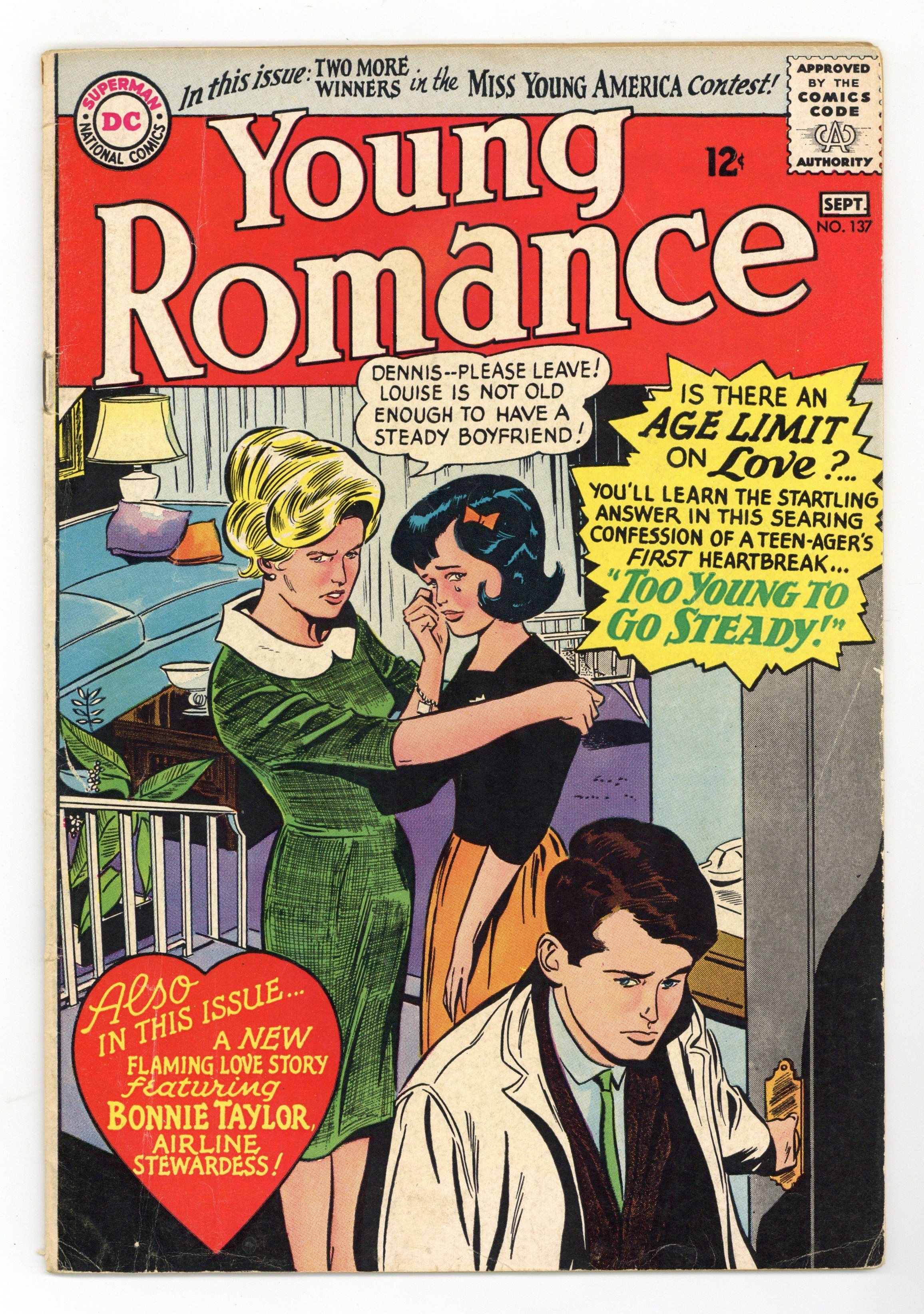 Cover pencils by Gene Colan. Stories by Robert Kanigher and unknown. Art by John Romita, Sr., Gene Colan, Bernard Sachs and unknown. In Cairo, Bonnie Taylor meets a man in a museum who believes she resembles an ancient Egyptian princess. She falls in love with him but he drowns saving her when their rented sailboat capsizes, just as the princess' lover did, in "Love Is Here -- Love Is Gone!" Plus: Louise and Dennis start to go steady in high school though her mother thinks it's too soon. After three years together, Dennis breaks up with her, and Louise finds it difficult to go out with any other boy in "Too Young to Go Steady!" Also: Hairstyle and makeup tips in Romance in Fashion 1-pager "Beauty News"! And: Laura Penn...Your Romance Reporter letters page (2 pages). 32 pages, full color. Cover price $0.12.