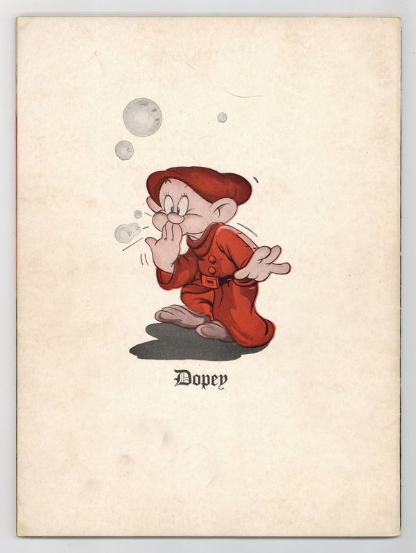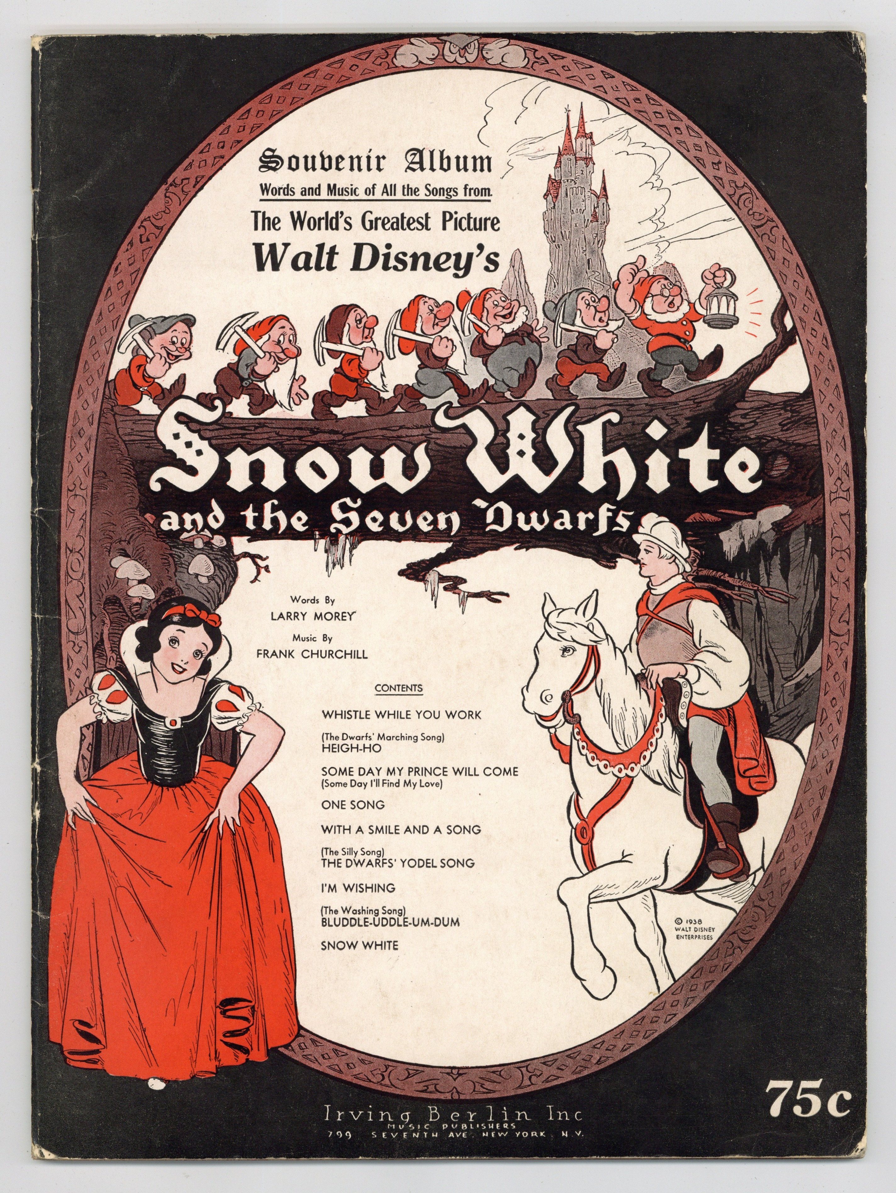 Published 1938 by Irving Berlin, Inc..$99.00Souvenir Album presenting Music and lyrics from Walt Disney's Snow White. Includes illustrations. Words by Larry Morey. Music by Frank Churchill. 8 3/4" X 11 7/8". 52 pages. Partial Color. Cover price $0.75.