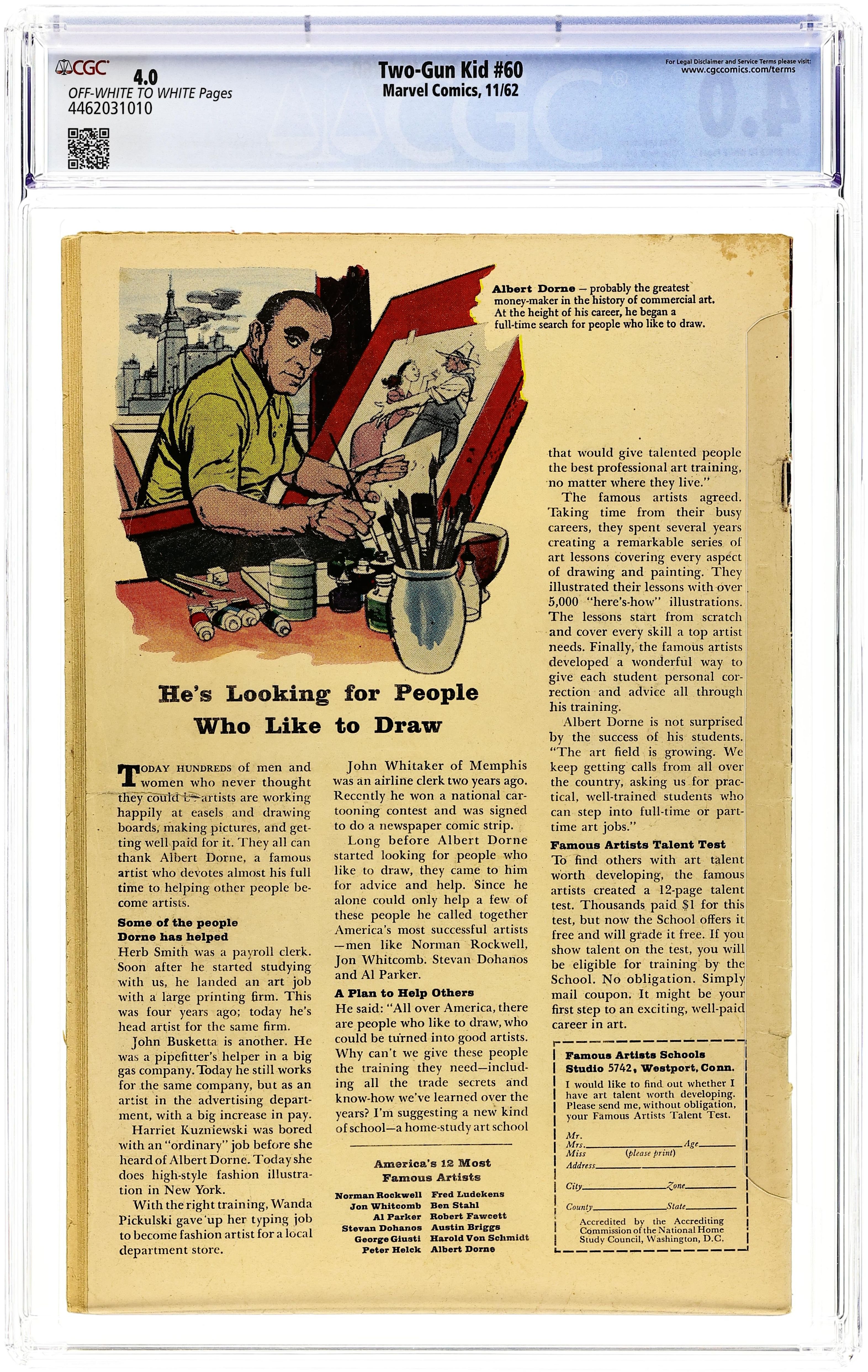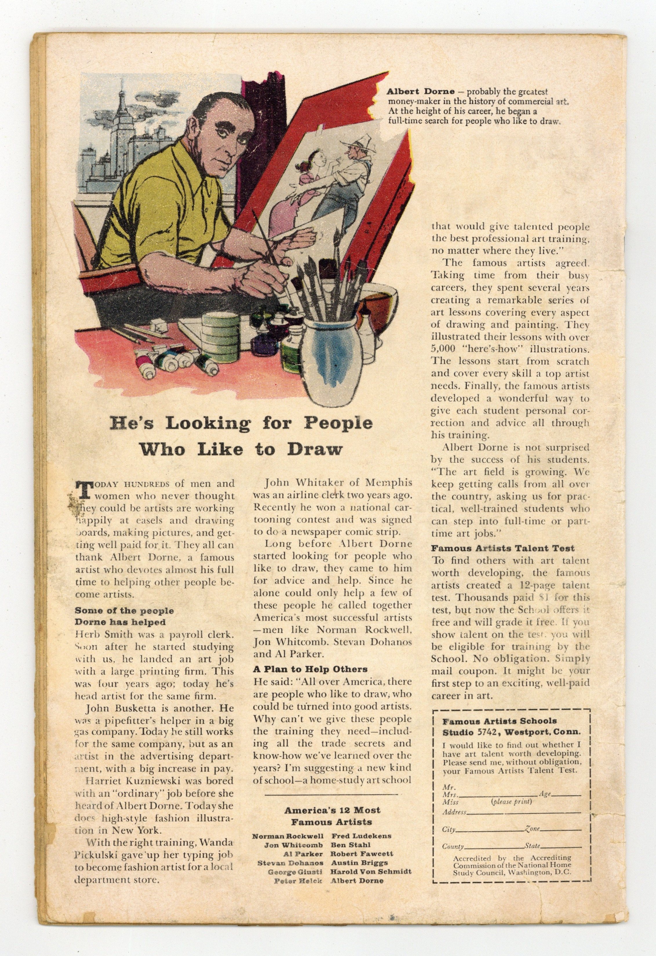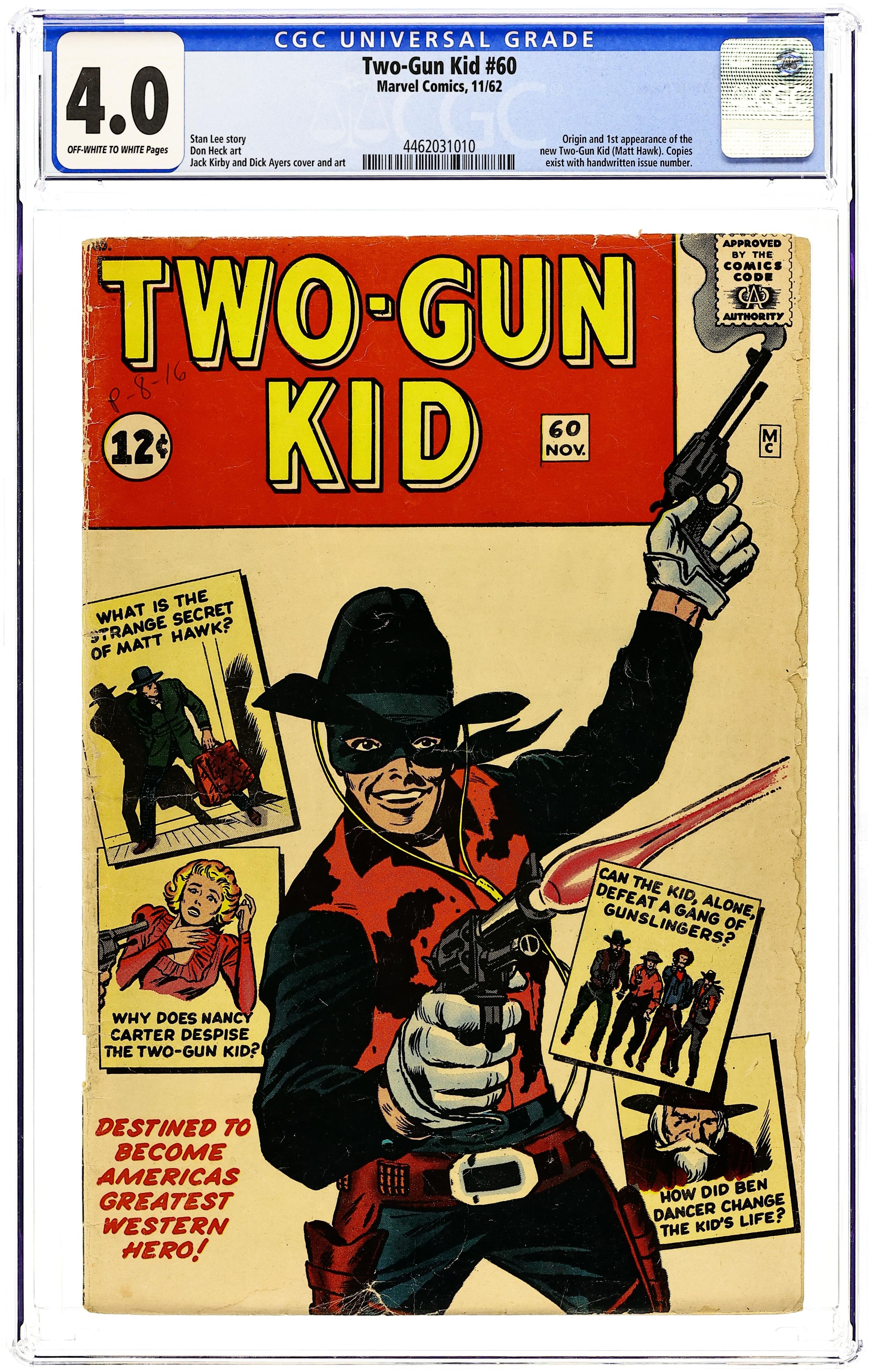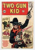 Cover pencils by Jack Kirby, inks by Dick Ayers. "The Beginning of the Two-Gun Kid," script by Stan Lee, pencils by Jack Kirby, inks by Dick Ayers; Matt Hawk arrives from the East; After helping Ben Dancer with two crooks, Ben teaches him all he knows and Matt becomes the Two-Gun Kid. "No Guns in Town" text story, art by Joe Maneely. "The Outcast," script by Stan Lee, art by Don Heck; Takawana schemes to remove Growling Bear and his son from power to become a Navaho Chief. "I Hate the Two-Gun Kid," script by Stan Lee, pencils by Jack Kirby, inks by Dick Ayers; Clem Carter and his gang rob Matt Hawk, taking money Nancy Carter had left with Matt. 36 pgs., full color. $0.10. Cover price $0.12.