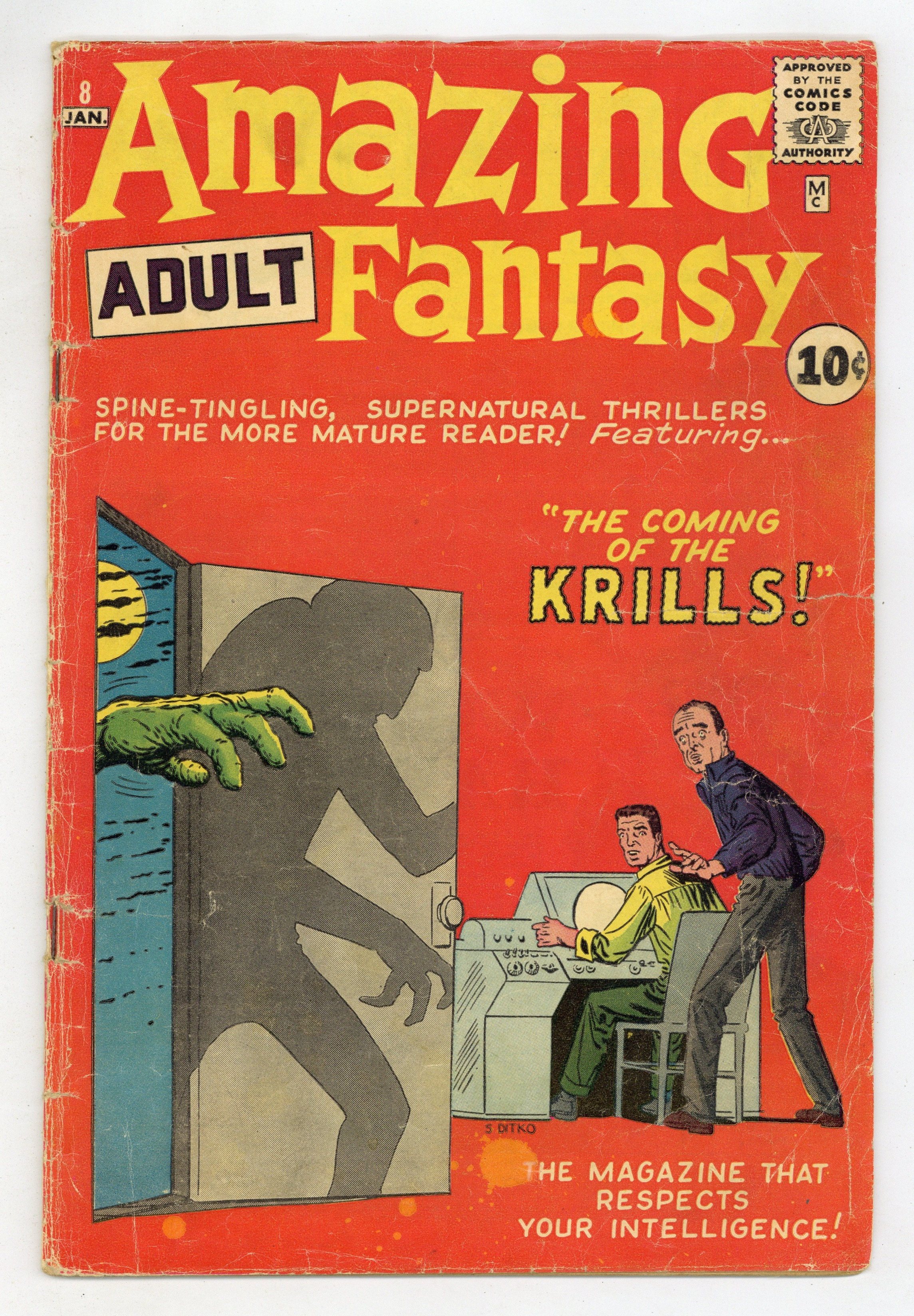 Cover art by Steve Ditko. The Coming of the Krills; The alien Krill offer the most beautiful woman in the universe to an earthman if he will betray his native planet but finds to his regret that beauty is truly in the eye of the beholder. Everyone Likes a...Ghost Story; A swindler buys a castle with the intention of faking it as a haunted attraction, but then he meets a real ghost and dies of heart failure thus ends up legitimately haunting the castle. The Eyes of Edward Morgo. The Yo-Yo. A Monster Among Us; An alien ambassador lands on Earth and, because of its monstrous appearance, is driven away. All scripts by Stan Lee, all art by Steve Ditko. 36 pgs. $0.10. Cover price $0.10.